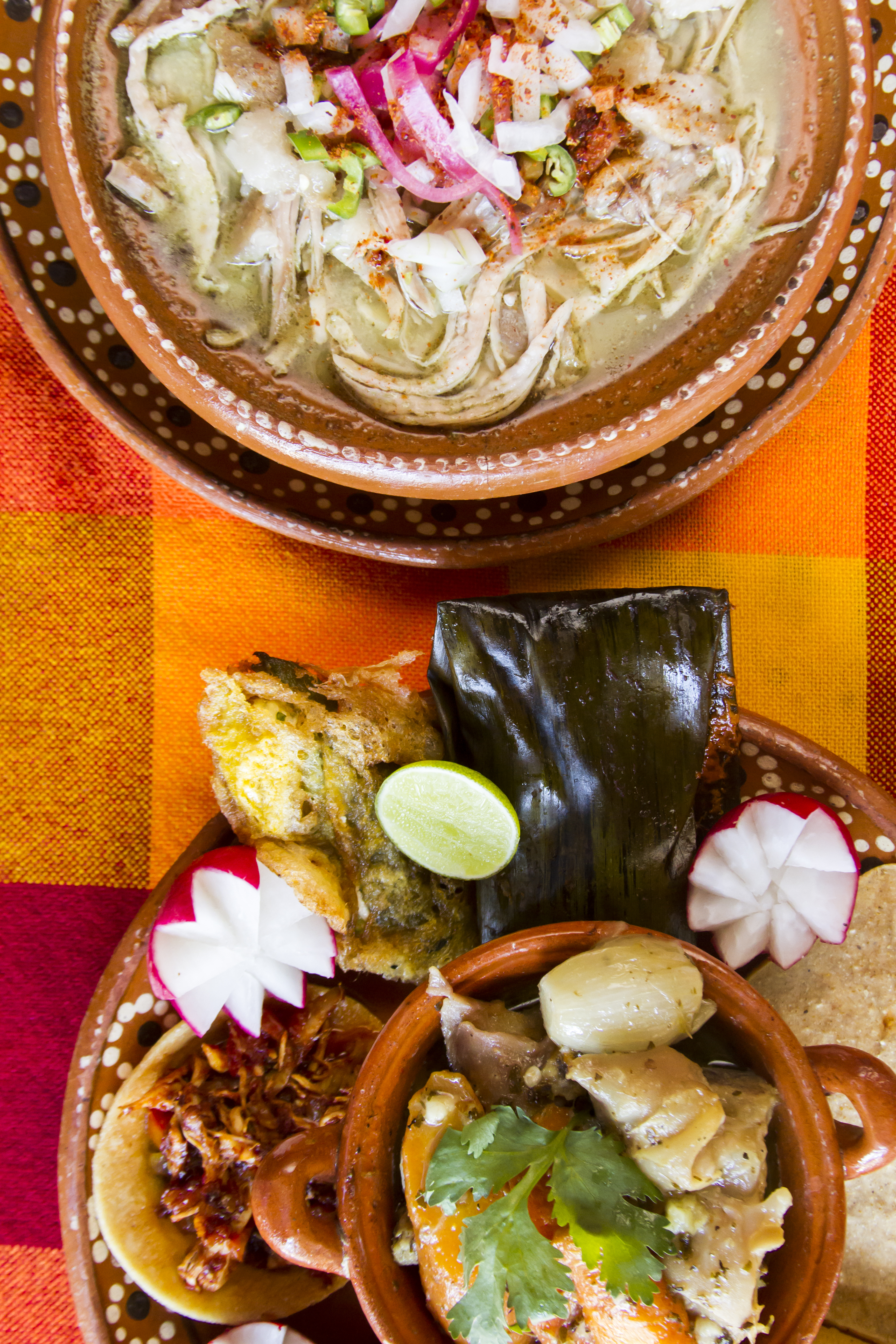 De ascendencia indígena son los moles rojo, verde, clemole, ayomole, huaxmole y todos los chilmoles o salsas de chile; las tortillas, memelas, picadas, chalupas, tostadas, totopos; los atoles blancos y dulces combinados con diversas frutas; los pozoles blanco, verde y de elote o elepozole; los frijoles se preparan de muchas maneras y son de alimento cotidiano.
