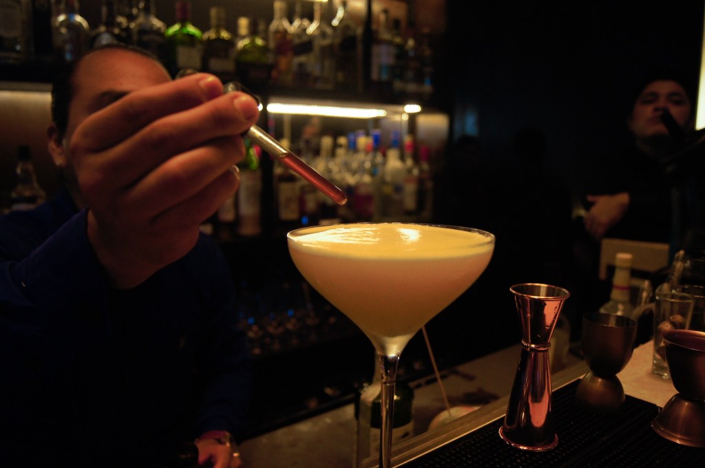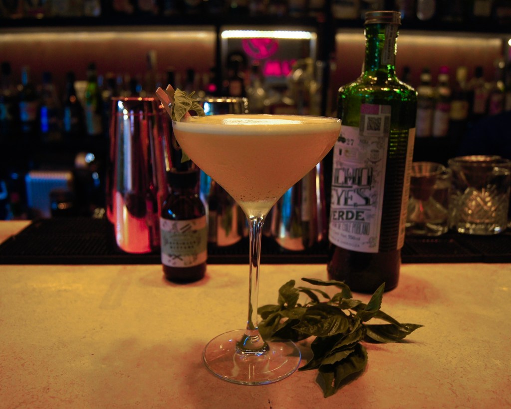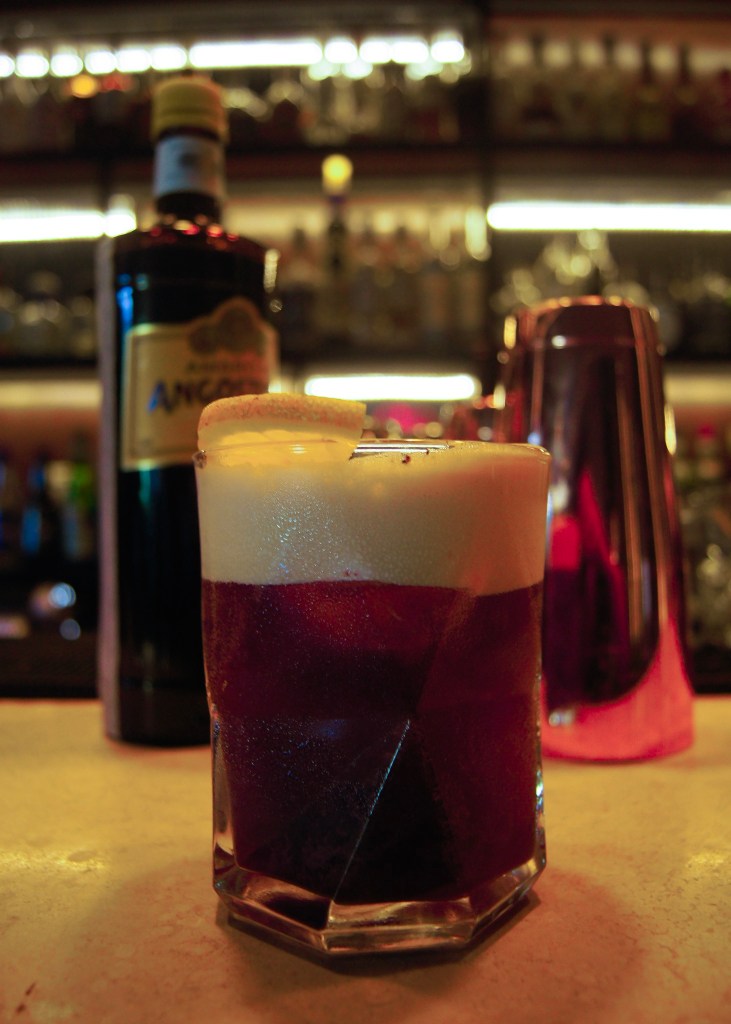 Durante nuestra visita a Umami para conocer a André Rivera y degustar su trabajo, tuvimos la oportunidad de probar tres de los cocteles de su carta que se encuentran disponibles en el restaurante, todos elegidos por él. En primer lugar, presentó ante nosotros un trago de color ámbar con aromas a cardamomo y café, que puede ser identificado en el menú como Expresso Amaro, una especie de carajillo, quien en sus ingredientes se encuentra presente el Amargo de Angostura y una carga de expresso, entregando un sabor amargo, refrescante y sumamente aromático, potenciando el sabor del café y que persiste en la boca aún después de beberlo; una experiencia interesante para todo amante del café, sobre todo por su textura suave y espumosa.