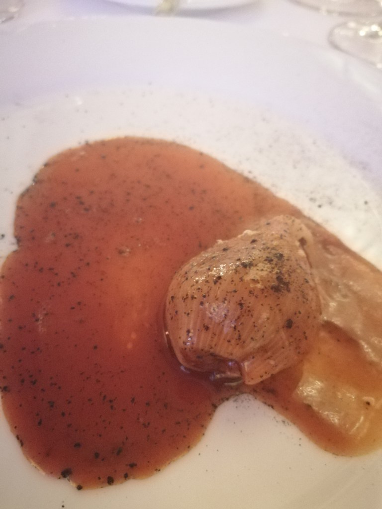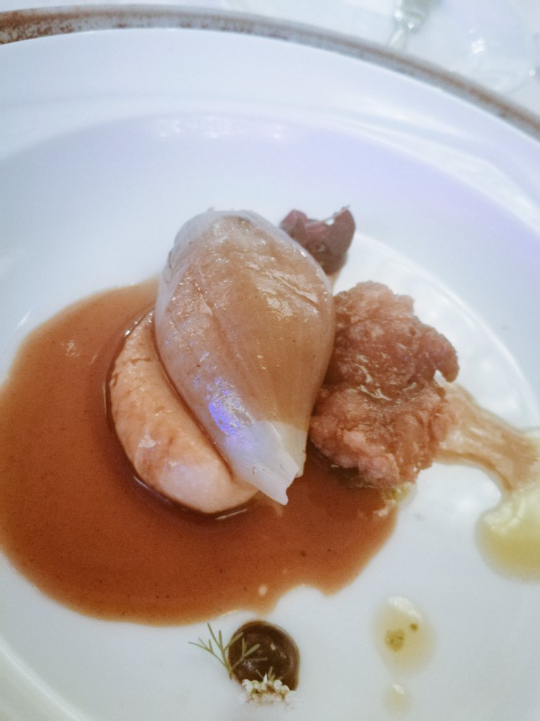Cebolla al carbón con hongos de lluvia, jus y molleja crujiente por el Chef Eduardo Morali.