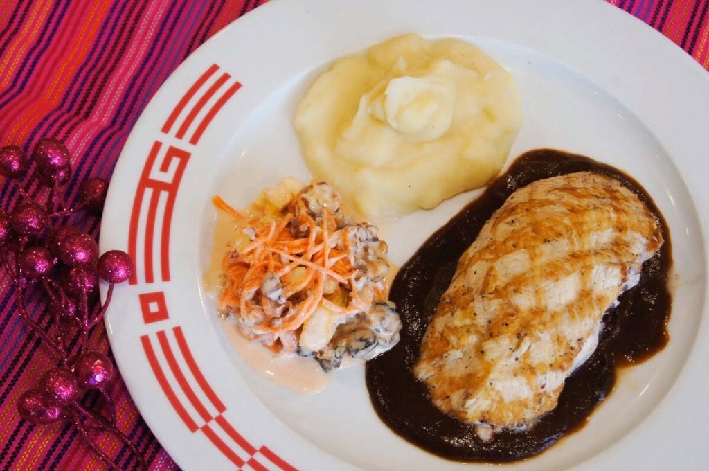 Otro plato más dentro de este menú de temporada es la pechuga rellena de queso con nueces y arándanos en salsa de ciruela y vino tinto, que sincroniza sus ingredientes para dar resultado a un platillo fuerte, sustancioso y cargado de potentes sabores que se identifican en cada bocado: el cremor del queso y la acidez y dulzor de arándano y la ciruela quedan muy perfectos para dar el toque casero de este platillo. Puede comerse solo o acompañado de pan y combinarse con una guarnición de ensalada de zanahoria y nueces que complementa a sus ingredientes frutales que contiene la receta de esta pechuga.