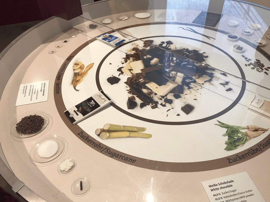 Al terminar la producción del chocolate en la fábrica transparente, en la última sección de la primera planta del museo, se encuentra la última parte de la sala, con paredes de cristales que proporcionan una vista panorámica de 180º del cause del río Rin y en donde se erige una fuente de chocolate que simula ser un árbol de frutos de cacao dorados, emanando un líquido espeso, aromático y dulce listo para provocar el éxtasis a quien se atreva a probar de su elixir. En esta fuente, que además se encuentra resguardada por una cinta de terciopelo rojo, una asistente de sala vestida como un trabajadora de la fábrica de chocolate, sumerge galletas gaufrette dentro de la fuente y las entrega a todos los visitantes que se acercan a la fuente; el sabor del chocolate tibio en el que se baña esta galleta es indescriptible, ya que balance entre el chocolate, su dulzor y su textura son tan perfectos que arranca un suspiro unísono a todos los que prueban este manjar; sale por completo de los sabores convencionales de chocolate que conocemos, un sabor al menos no reconocido por mis papilas gustativas que han tenido la oportunidad de probar diferentes chocolates al rededor del mundo. Cabe mencionar que no puedes tomar más de una galleta por visita, aunque la tentación sea grande, pues las intenciones del museo de que que te quedes con ganas de probar su sabor nuevamente se comienzan a tejer e incrementar hasta el final del recorrido.