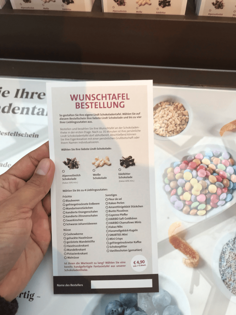 Entre la S8 y la S9 se encuentra una mesa con unas tarjetas que cuentan con ingredientes, tipos de chocolate y tópicos, de manera que puedas marcar 4 ingredientes que más te gusten, a manera que diseñes tu propia barra de chocolate. Entre los ingredientes destacan elementos como: cáscaras de naranja o limón, pimienta de Cayena, flor de sal, pistachos, nueces, bombones o chispas de colores. El costo de cada barra es de 4,90€ y el tiempo aproximado de fabricación es de 30 a 45 minutos, dependiendo del número de órdenes que tengan y el tipo de chocolate que se utilice para su elaboración, que puede ser chocolate con leche, chocolate amargo y chocolate blanco. En esta sección los visitantes pueden observar a detalle cómo se va elaborando la propia barra de chocolate diseñada por ellos mismos, dándoles la oportunidad de convertirse en maestros chocolateros. Aquí también se encuentra una pequeña tienda que tiene a la disposición de los visitantes esculturas de chocolate tridimensionales como Santa Claus, el conejo de Pascua o la réplica a escala de la catedral de Colonia; además de tablillas con el el sello de la ciudad o la fachada de la catedral.
