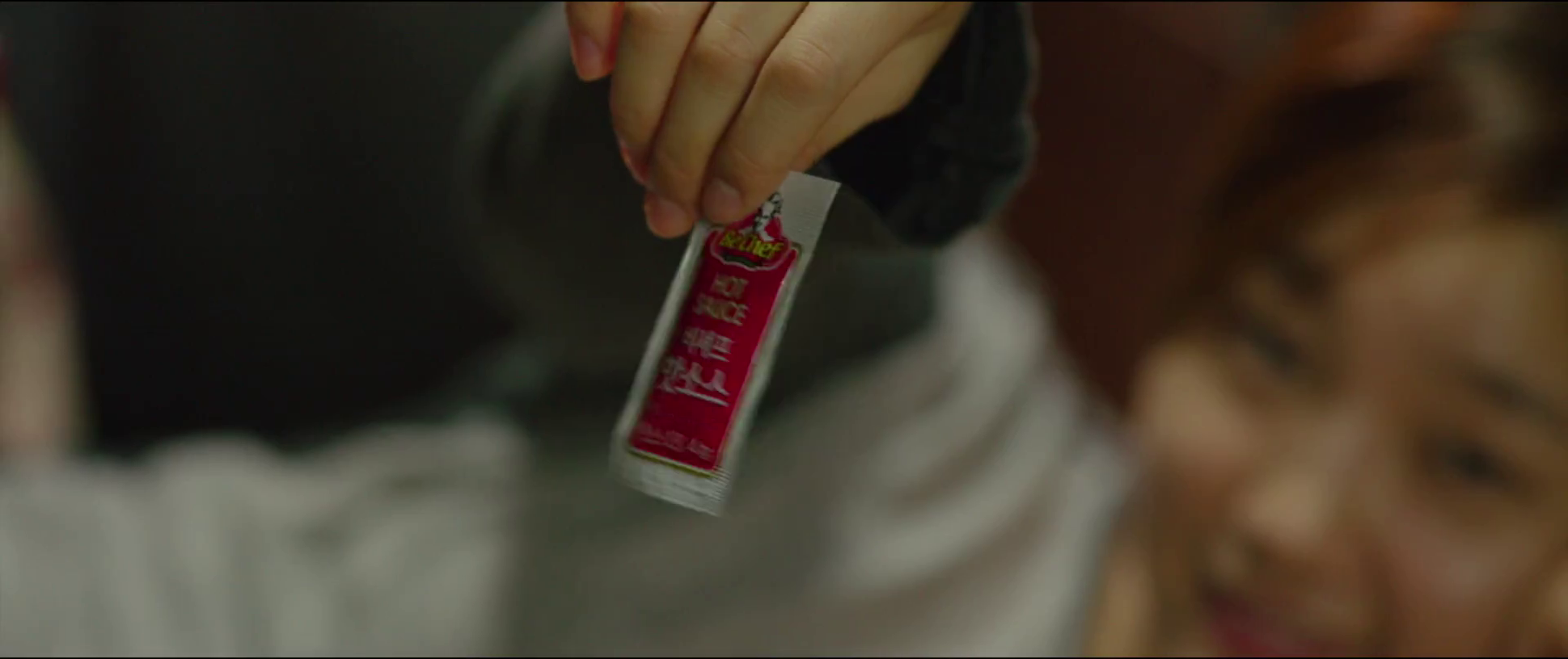 Otro de los alimentos que se hace participe como un arma, esta vez para luchar en contra de los obstáculos de la familia Kim que les impide tener la vida que quieren: la salsa picante, la misma con la que condimentan la pizza, esta es utilizada como un elemento de alerta, su color rojo emula la sangre y es un artilugio que pretende ser la huella marcada en la escena del crimen. Es vista constantemente en el primer acto, un arma de Chejov que eventualmente será disparada.