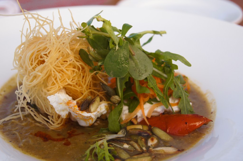 Otras opciones muy interesantes que se encuentran dentro del menú de desayunos son los huevos del nido crujiente, que se trata de huevos que son colocados dentro de pasta de arroz a la cual se le ha dado forma circular simulando un nido, la cual es montada sobre sobre vegetales y una salsa verde de pepitas de calabaza. Este platillo llamó nuestra atención de una manera muy peculiar, debido a que su confección da una presentación muy vistosa que hace justicia con su cúmulo de sabor que esconde entre su pasta entretejida; es muy divertido descubrir lo que se encuentra dentro para comerlo acompañado de un poco de la salsa con la que se presenta.