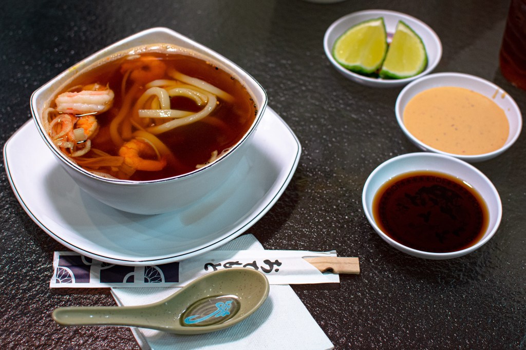 También recomendamos empezar a explorar su menú con una sopa Udon Especial, y como mencionamos en nuestra anterior visita a Sento Wok, el Udon es un fideo grueso popular en la comida japonesa, que está hecho a base de harina de trigo y que cuenta con una consistencia suave y adopta muy bien los sabores con los que se le mezcle. Esta sopa Udon Especial contiene consomé de pescado y un poco de picante a la cual se le agrega la pasta udon, kanikama y camarones.