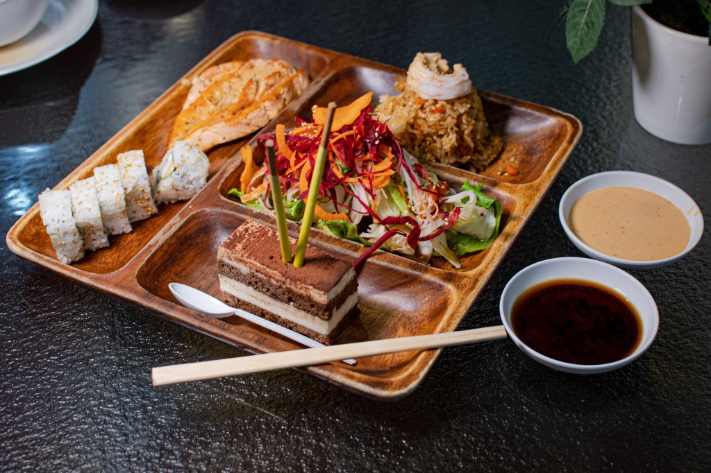Además de todo esto, está disponible un Menú Turístico que no necesariamente se debe ser turista para poder pedirlo y degustarlo. Este menú que incluye 150 gramos de salmón, que es cocido a la plancha y sazonado con especias, es acompañado de 5 piezas del rollo Filadelfia de camarón, una porción de ensalada kanikama, un yakimeshi vegetariano que se decora con un camarón al vapor y un postre del día, el cual puede variar entre gelatinas, tiramisú o tartas; este menú también incluye un té con limón como bebida. Lo que nos encanta de este platillo, además de que su precio es increíble, es una comida realmente balanceada, sustanciosa y que incluso se encuentra cargada de sabores únicos con un balance muy bien cuidado. Si tienes un poco de suerte, tal vez te toque probar los famosos Pocky, el cual utilizan para decorar los postres que se agregan al Menú Turístico.