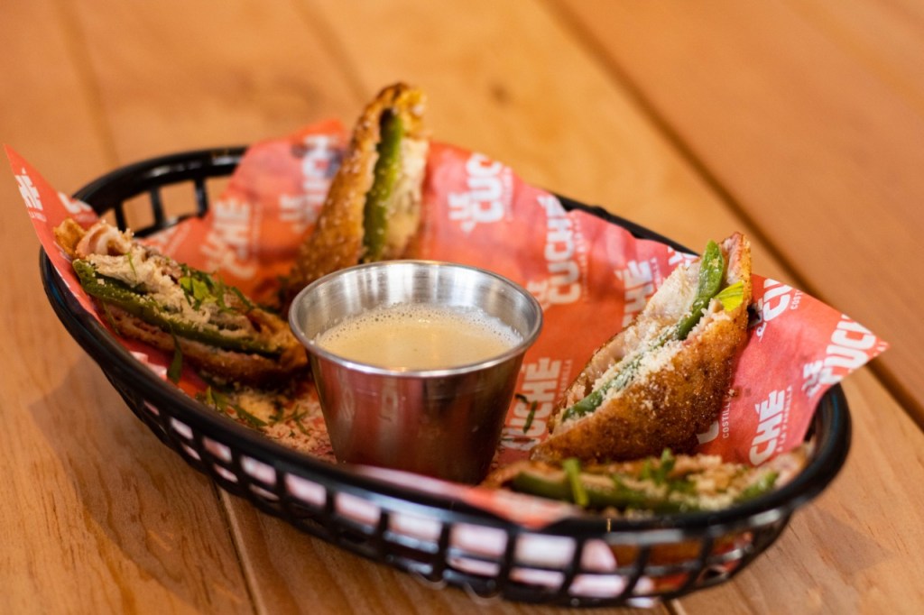 Otra entrada perfecta son sus Le Cuchiles, los cuales constan de unos chiles jalapeños rebosados que están rellenos de queso gouda. Algo que me encantó de estos Le Cuchiles es que no pican, por lo que podrás disfrutar ese sabor característico del chile, combinado con el queso sin que la pungencia sea predominante, y que además le va perfecto al aderezo de ajo con un toque de chile serrano con los que se acompaña, para compensar un poco el picor a la hora de comerlo.