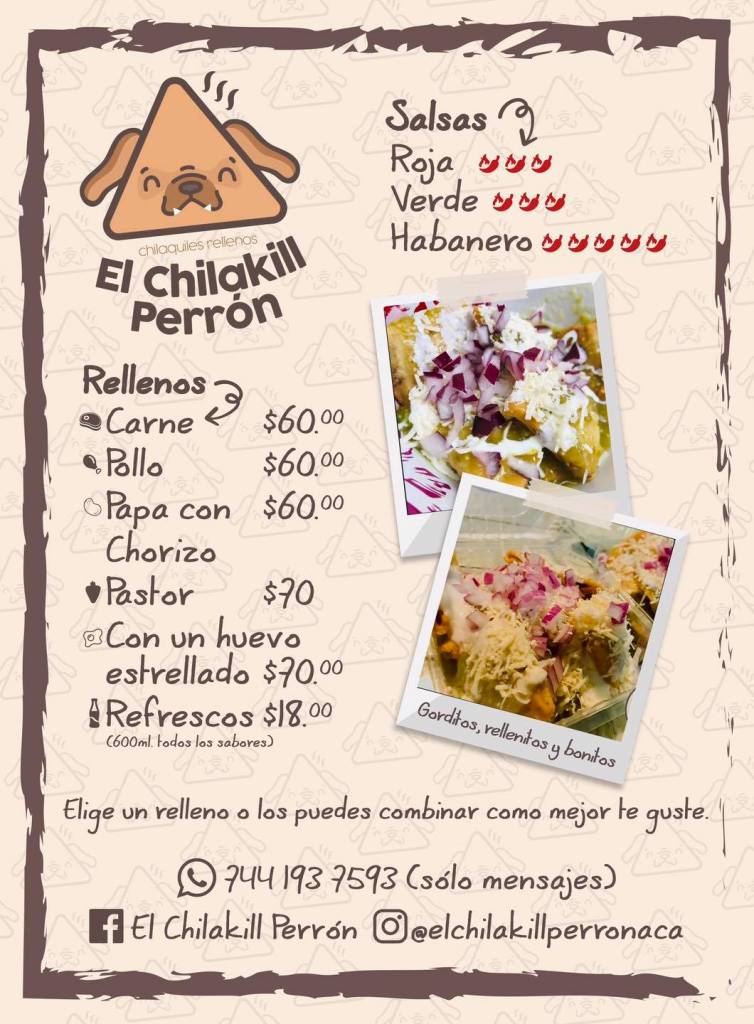 Si después de leer esta nota te has quedado antojado de probar los chilaquiles rellenos, te recordamos que puedes adquirirlos con el relleno que desees haciendo tu pedido a través de WhatsApp al número 744 193 7593 (únicamente mensajes) o por medio de sus redes sociales que son Facebook e Instagram. No te pierdas sus publicaciones y mantente al pendiente para poder conocer los rellenos limitados que el Chilakill Perrón tiene para complacer tus antojos y experimentar con sabores que te van a sorprender.