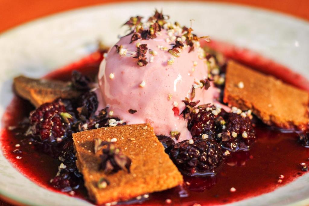 - Acompañamos con helado de fresa, amaranto, flores de albahaca y galletas.
