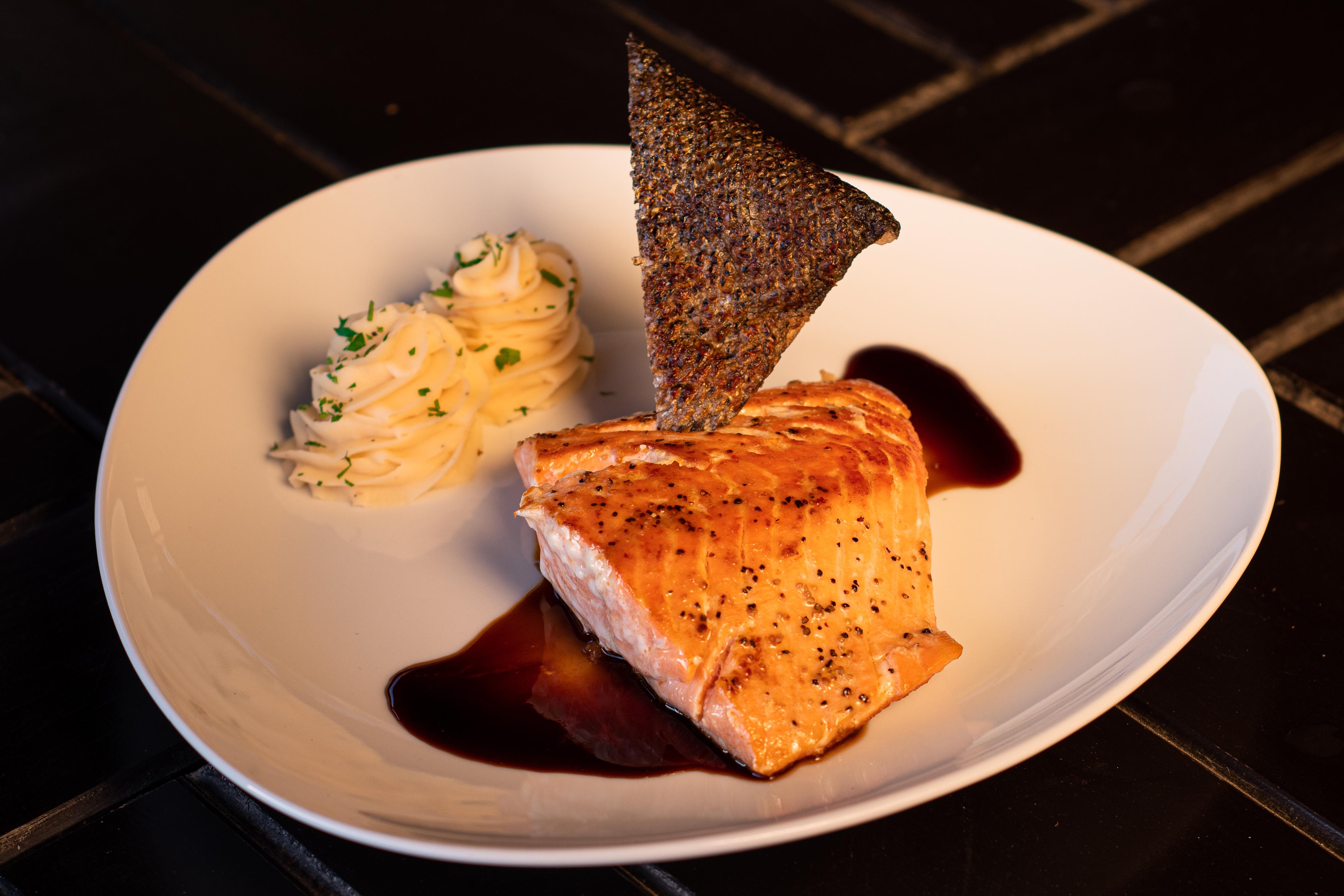 Para poder conocer la experiencia de comer este salmón, se debe probar todo en conjunto: el salmón, con un poco de la miel con la que es bañado, chicharrón y puré, pues sus texturas y los sabores que aportan cada uno de los elementos, es lo que le otorga el balance perfecto: la suavidad del pescado, la sensación cremosa del puré, lo crocante del chicharrón de pescado (que además es exquisito), la densidad y el cuerpo de la salsa de miel.