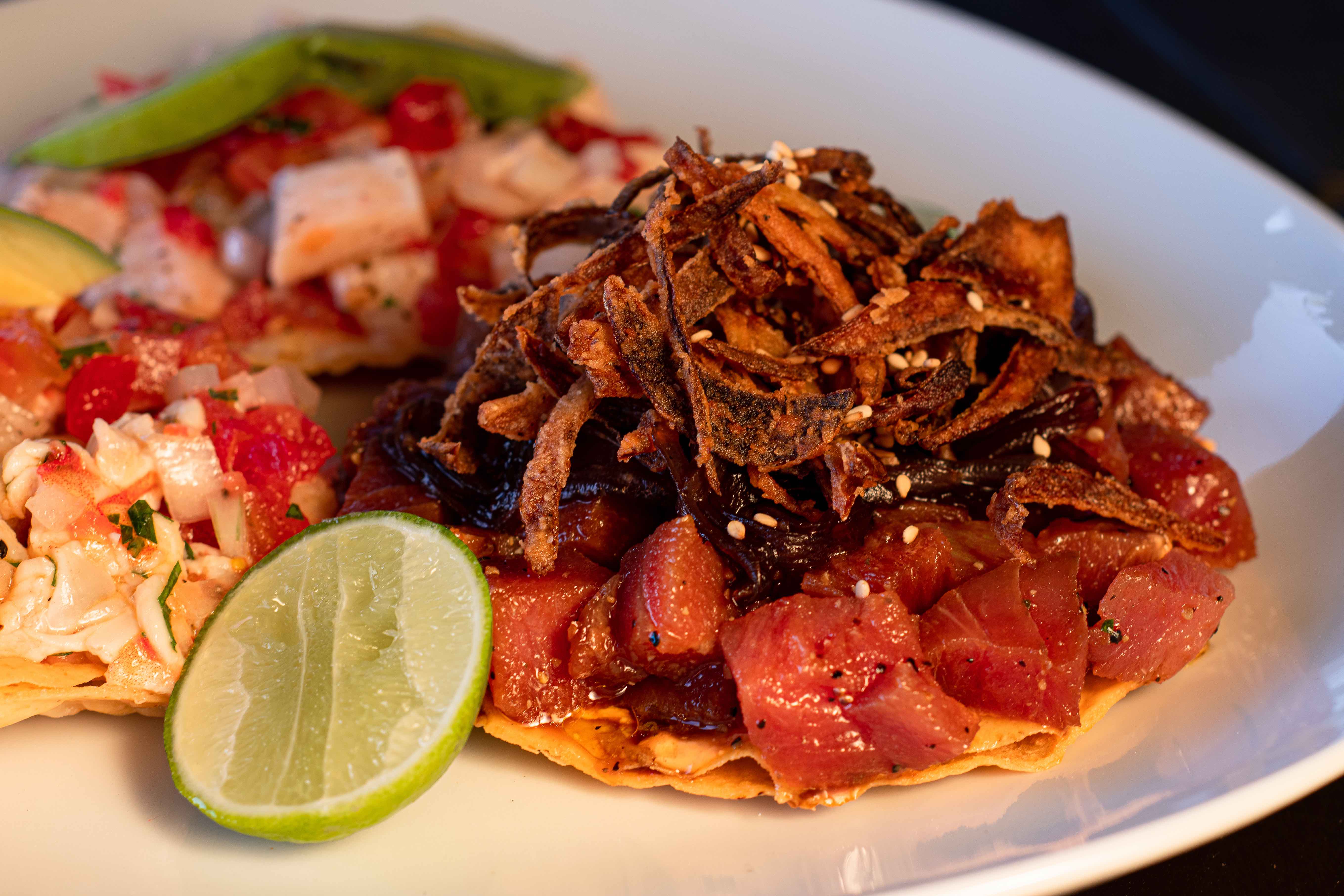 El primer platillo que pudimos probar fue la Trilogía de Tostadas, y como su nombre lo indica, está compuesto de tres tostadas de maíz, las cuales son servidas con camarón, pescado y atún, cada una. En lo que respecta de las tostadas de camarón y pescado, la presencia del limón, crea las bases de los ceviches característicos de la costas del país, lo cuál las dota un sabor familiar y tradicional.