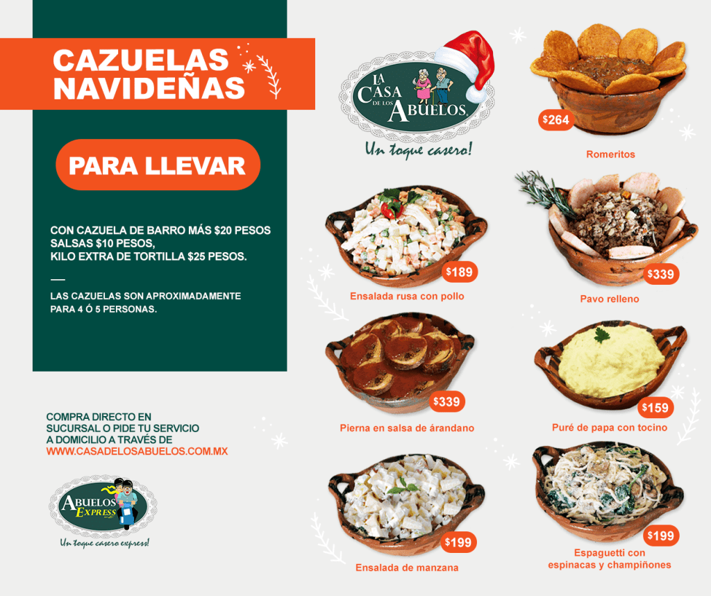 La Casa de los Abuelos te ofrece en esta navidad sus tradicionales cazuelas navideñas, las cuales llevan una gran variedad de deliciosos guisos, para que esta cena la degustes con sabores típicos que hagan disfrutar los platillos de principio a fin.