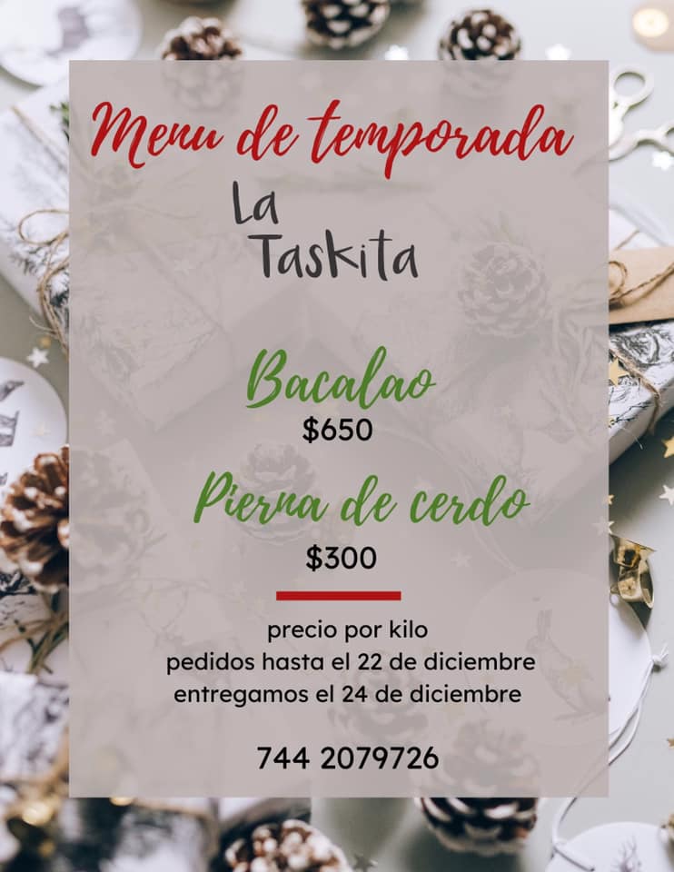 Los platillos tradicionales nuca deben de faltar en estas fechas, por eso «La Taskita» te ofrece en su menú navideño, su receta especial de bacalao y pierna de cerdo, dos de los platillos más populares para disfrutar en estas fechas, los cuales están preparados con los mejores ingredientes y con el sazón que los caracteriza.
