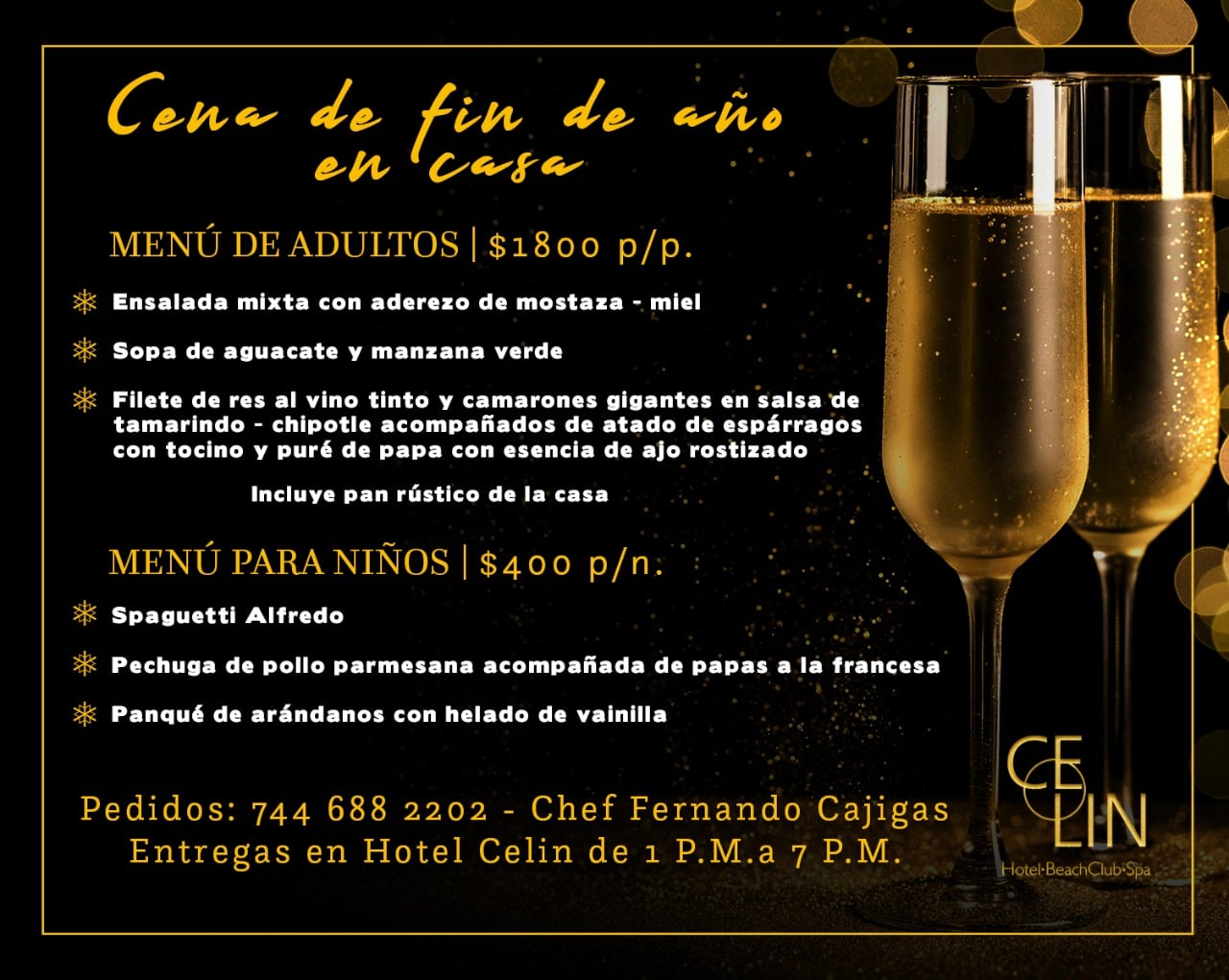 El Hotel Celin Acapulco ofrecerá un delicioso menú para que disfrutes de la cena de fin de año en compañía de ti familia e incluso amigos, de la mejor manera debido a que, dentro de sus opciones se encuentran platillos para adultos y para niños, preparados con ingredientes exquisitos y que serán del agrado de todos los que participarán en la cena.