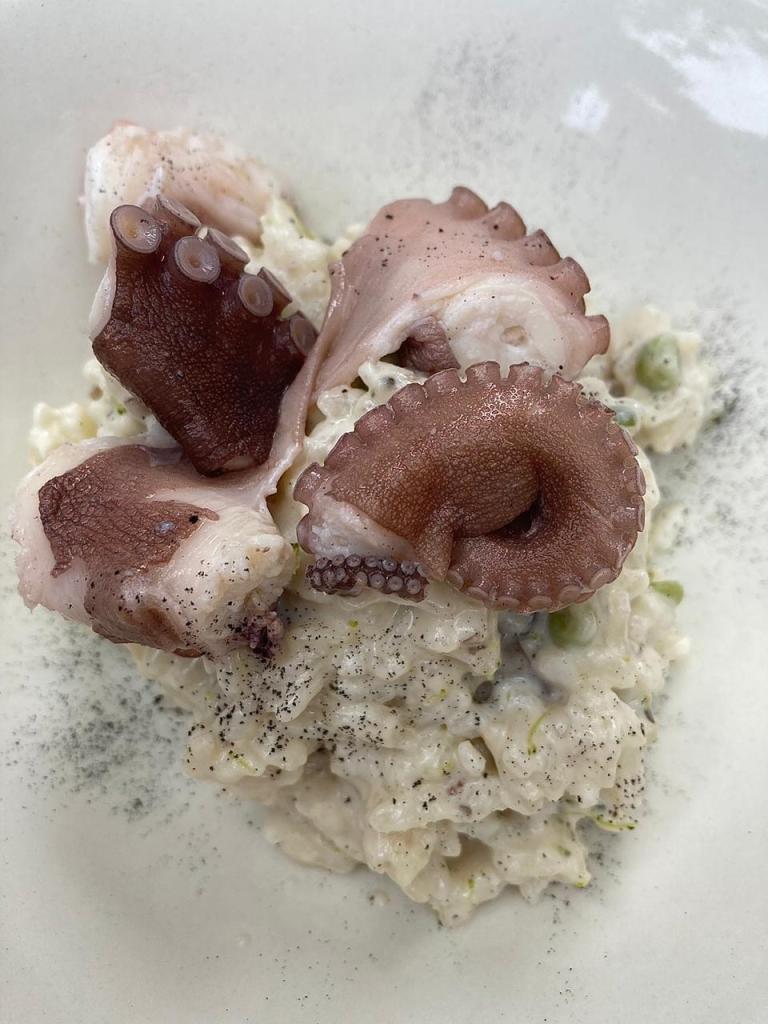 Para la entrada fue traído a nuestra mesa un Risotto de milpa al vino blanco, que contenía elote, calabaza, champiñones y chícharos. Su olor era cremoso y ligeramente marino, pues incluía una porción de pulpo salteado que, a mi consideración, estaba perfectamente cocido, pues era muy suave y lo suficientemente consistente para conservar todas sus texturas. Algo característico de este menú y de algunos platillos de Rosmar son las cenizas; para este risotto se utilizó la ceniza de tortilla para aliñarlo.