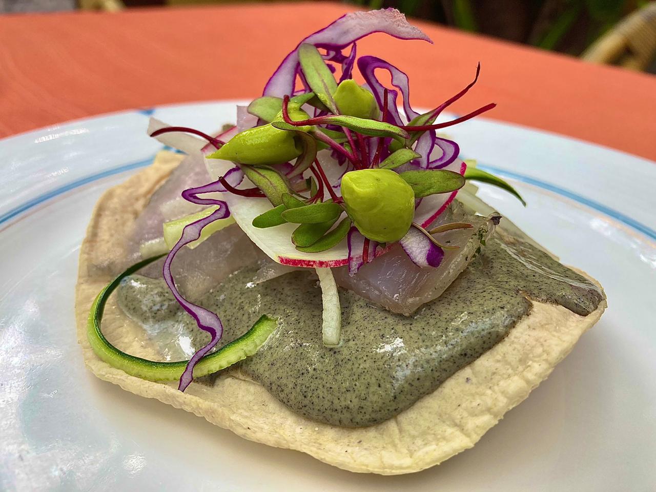 A nuestra llegada fuimos recibidos con una tostada con pescado curado: marinado en quelites y ahumado en copra de coco. Aquí pudimos percibir el sabor marino y salado del pescado combinado con un toque de mayonesa, que le iba muy bien al aderezo con el que se acompañó la tostada, así como el puré de aguacate al coco con el que decoró. La porción de la tostada era mucho más grande a la que pude imaginar con el nombre, siendo un aperitivo ideal para comenzar a conocer el menú que se tenía preparado para esta ocasión.