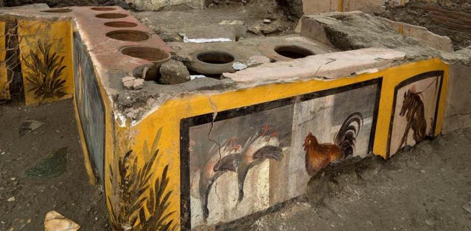 Otro descubrimiento extraordinario sucedió en el área arqueologica de Pompeya, aquella ciudad destruida en el año 79 d.c por la erupción del Vesubio y que hoy fue el origen del hallazgo de un «Termopolio», lugar donde se servía comida y bebida a los habitantes, intacto y decorado y aún con restos de alimentos.