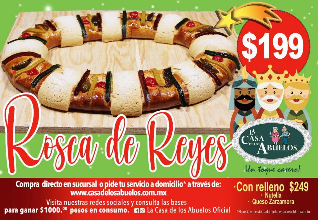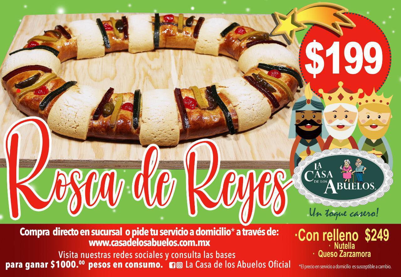 En «La Casa de los Abuelos» podrás degustar y disfrutar de una rebanada de su deliciosa rosca de reyes, la cual cuenta con la receta tradicional de la casa y la puedes pedir con un relleno de nutella o queso zarzamora, para deleitar el gusto de todos los presentes.