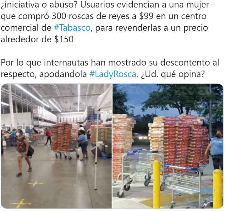 En las redes sociales, varios usuarios hicieron viral las imágenes de una mujer comprando al rededor de 300 roscas en una conocida y concurrida tienda departamental, para después a palabras de ellos, revender a un precio mayor de lo que las había comprado.