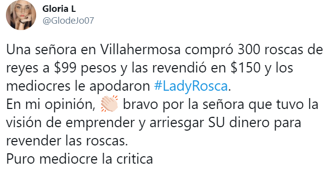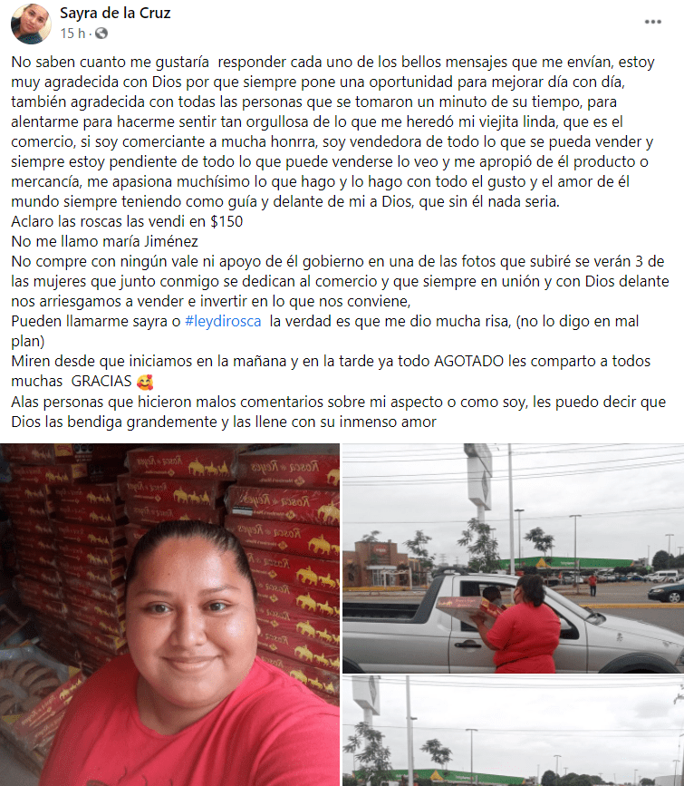 Dijo también en la publicación que no le importaba tanto el pseudonimo de #LadyRosca como la habían bautizado y que gracias a las personas que le compraron las roscas porque afortunadamente, terminó de vender todas desde las primeras horas del día que empezó.
