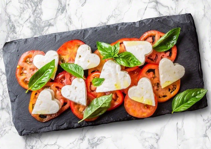 Si te gana el tiempo y no tienes una idea de que preparar para la cena, la ensalada romántica de tomate y rodajas de mozarella, puede ser tu mejor y más exquisita opción de último momento para sorprender a tu pareja en este día tan bonito.