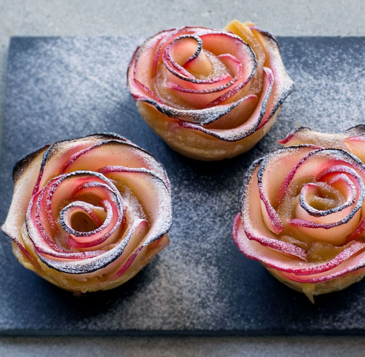 Y como sabes que le cena no está completa si es que falta el postre, te recomendamos hacer estas deliciosas y sencillas rosas hechas a base de tarta de manzana y que servirán de un bonito arreglo de flores comestible, si es que aún no has conseguido el tuyo natural.