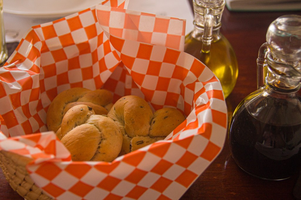 A mi mesa fue colocado pan recién hecho en la casa, fresco y muy suave, que puede degustarse mientras uno escoge en el menú el platillo de preferencia o también mientras se espera a que la comida salga de la cocina. A disposición de cada mesa se encuentra vinagre balsámico y aceite de olivo para poder degustar el pan.