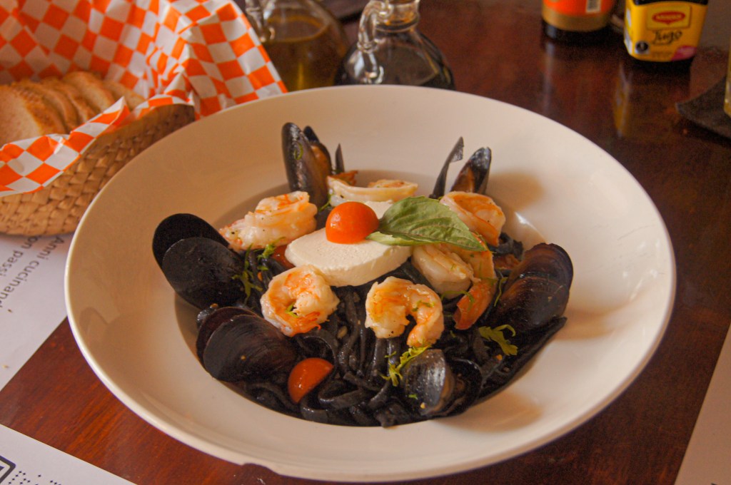 Después de la pizza, me fue presentada a la mesa una pasta, un tagliatelle con tinta de calamar al aglio olio y mejillones. Este platillo es llamativo desde que se coloca en la mesa, debido a que su característico color negro no puede pasar desapercibido en ningún momento; esta se sirve con queso parmesano fresco y recién rallado.