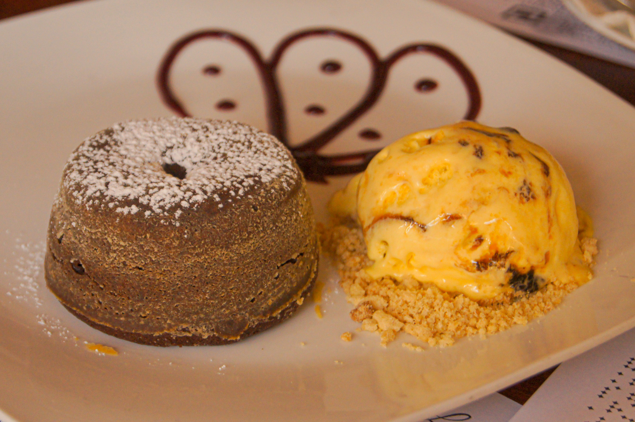Para cerrar, tuve dos postres que me cautivaron. El primero era un Sofiato d’Cioccolato, el cual me recordó mucho al ya conocido volcán de chocolate, ya que a la hora de partirlo y comenzar a comerlo, el chocolate que tiene en su interior se derrama. Acompañado de este, estaba servido un poco de helado con toques de café, para dar contraste al sabor del chocolate y también para generar una combinación de temperaturas entre ambos sabores.