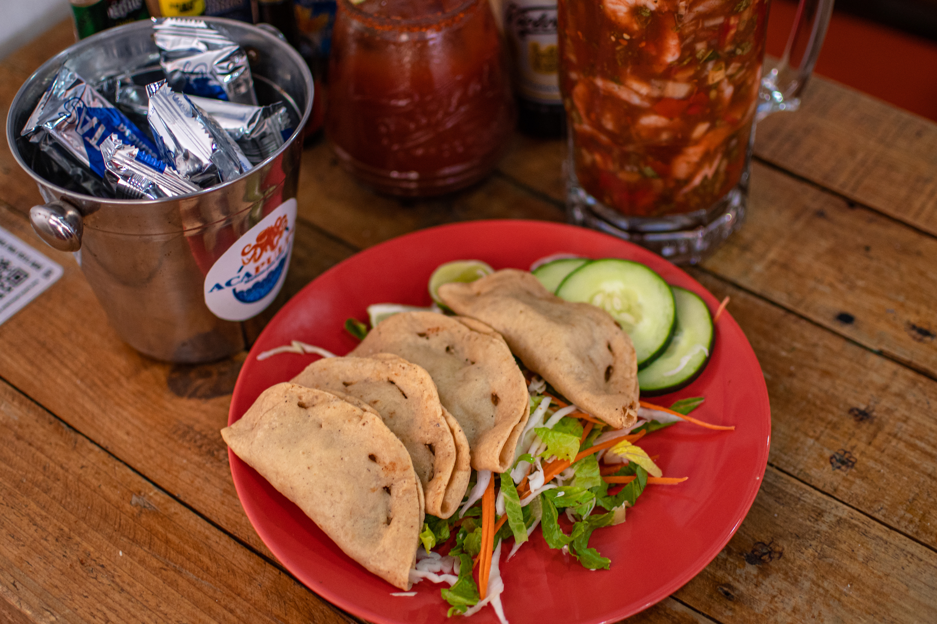 Al pasar con el aguachile Acapulpo, uno de los platillos estrella de este lugar, el cual está compuesto por camarones cocidos con limón, pulpo, Clamato, cebolla morada, pepino y chile habanero, pude percatarme de la cantidad de camarón y pulpo que contiene, haciéndolo un platillo (al igual que el ceviche) que asegura que en cada bocado puedas tener un poco de marisco para degustar de principio a fin. Este aguachile es muy fresco, ideal para un día después de fiesta, una tarde calurosa o un día en la playa; los sabores marinos y tropicales le van muy bien para maridarse con cerveza o una bebida sin alcohol.