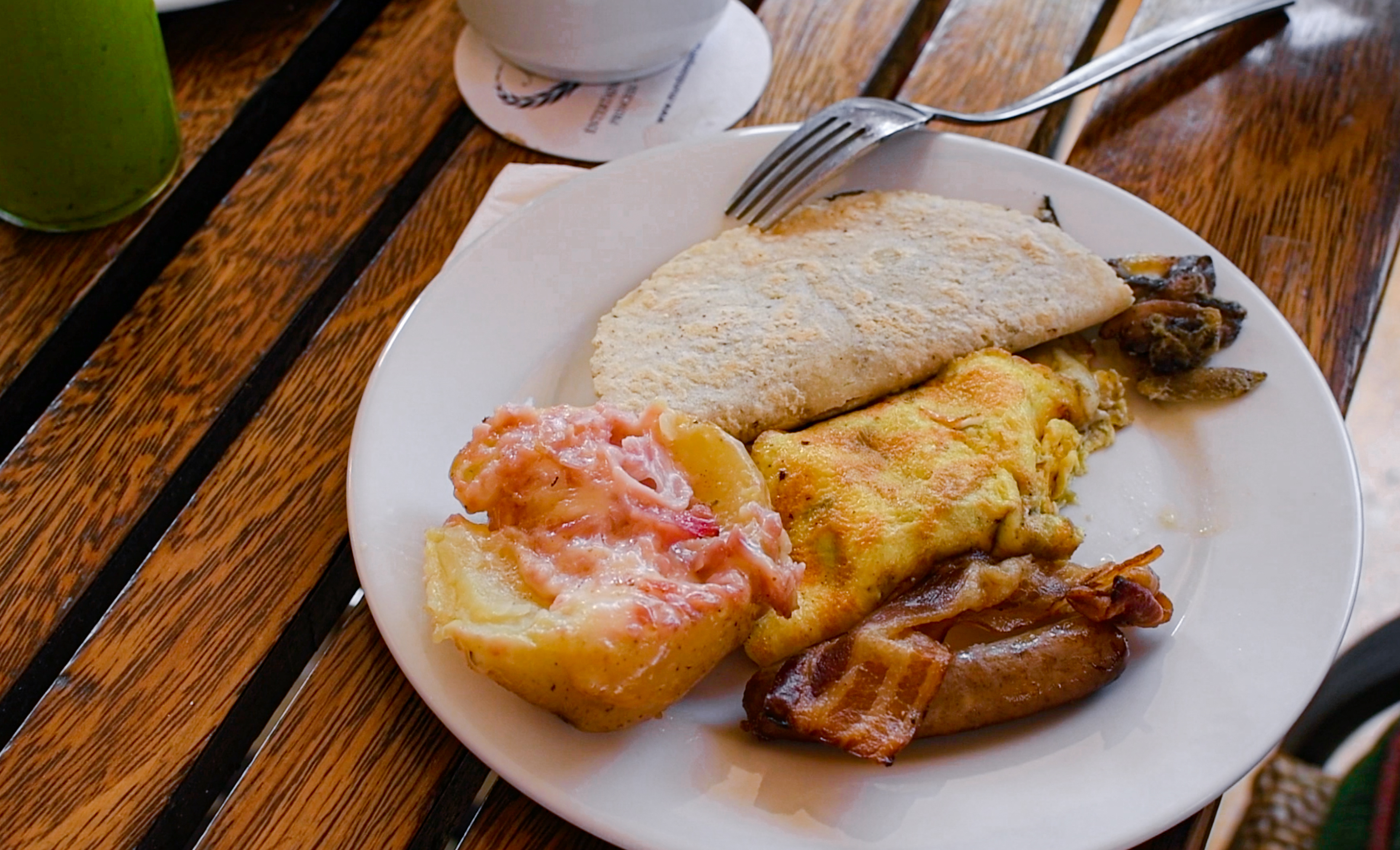 La terraza es un simple pero encantador espacio para desayunar, frente al mar y con una vista espectacular a la piscina principal y al Océano Pacífico, da la oportunidad de recibir el amable roce de la brisa marina. Los cautivadores toques de diseño incluyen paredes de pierda, colores vibrantes y una hermosa pérgola cubierta de ramas, hojas y enredaderas retorcidas.