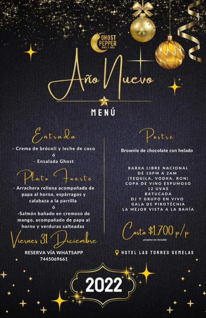 Ghost Pepper se convirtió —desde su apertura— en uno de nuestros lugares favoritos. En este fin de año, traen para todos sus comensales su gran cena de fin de año, en donde no solo podrás disfrutar un ambiente increíble, divertido con música en vivo y DJ, sino que además ofrecen un menú variado con comida de mar o de tierra, en donde se puede escoger entre arrachera o salmón, al igual que una barra libre nacional que estará disponible durante la cena. Para poder reservar, deberás enviar un mensaje de WhatsApp dando click aquí.
