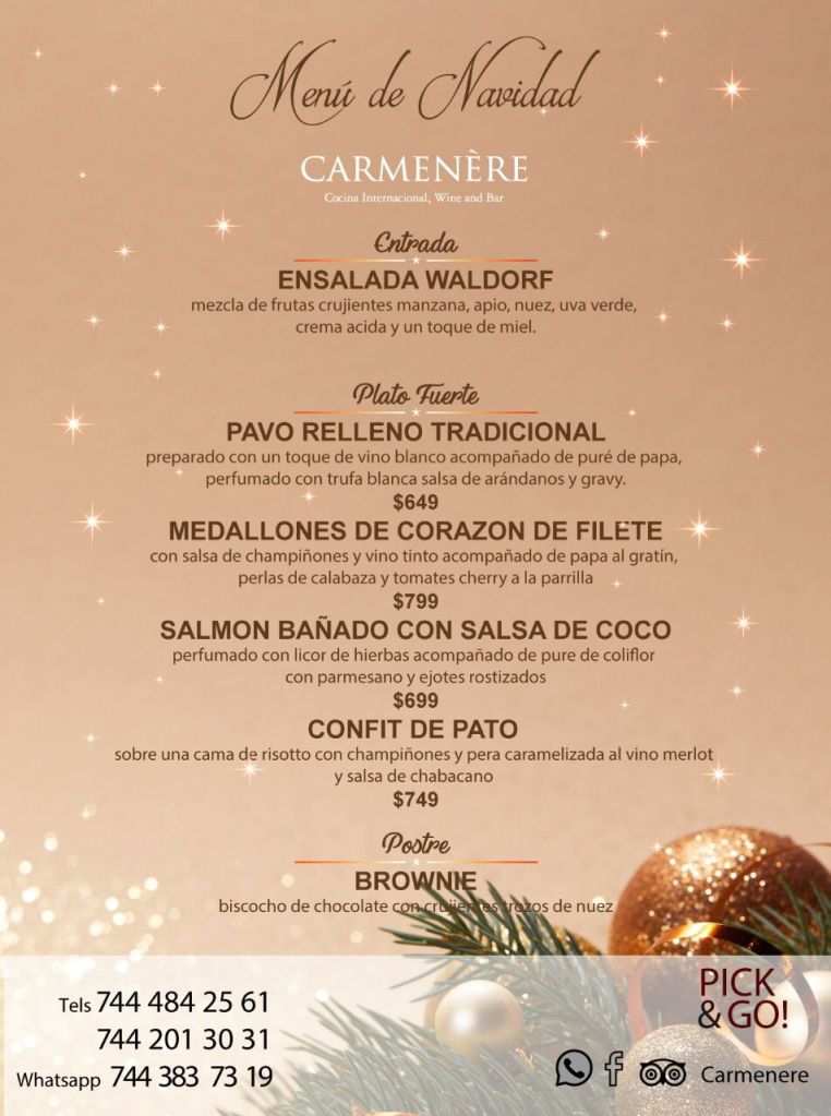 Si lo que deseas es pasar una Noche Buena en un lugar muy tranquilo, privado y con comida deliciosa, Carmenère es la opción ideal. Junto con la tradicional ensalada Waldorf, ofrecen cuatro opciones a elegir para cenar, el cual puede ser pavo relleno tradicional, medallones de corazón de filete, salmón bañado en salsa de coco o confit de pato. Sin embargo, si tus planes son quedarte en casa con la familia, Carmenère pone a disposición de los comensales la opción de pick&go, para ordenar lo que tú y tu familia deseen y pasarlo a recoger a las instalaciones del restaurante.