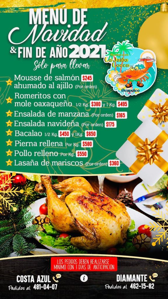 Nuestros queridos amigos de la Jaiba Locca traen para todos los acapulqueños su delicioso menú de navidad y año nuevo, especial para aquellas personas que desean invertir más tiempo cocinando que conviviendo con la familia. Para eso, su menú es exclusivo para recoger en el establecimiento y llevar a casa, en donde podremos encontrar platillos tradicionales de navidad: romeritos, ensalada de manzana, bacalao y pierna rellena.