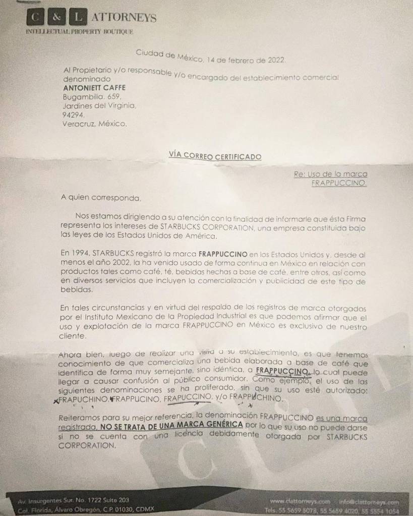 En ese sentido exigieron a las cafeterías que “desista y retire el uso, venta, promoción a cualquier actividad comercial relacionada con la marca Frappuccino o las variantes Frapuchino, Frappucino, y/o Frappuchino en su establecimiento mercantil”, menú, carteles, página web, redes sociales y cualquier tipo de publicidad.