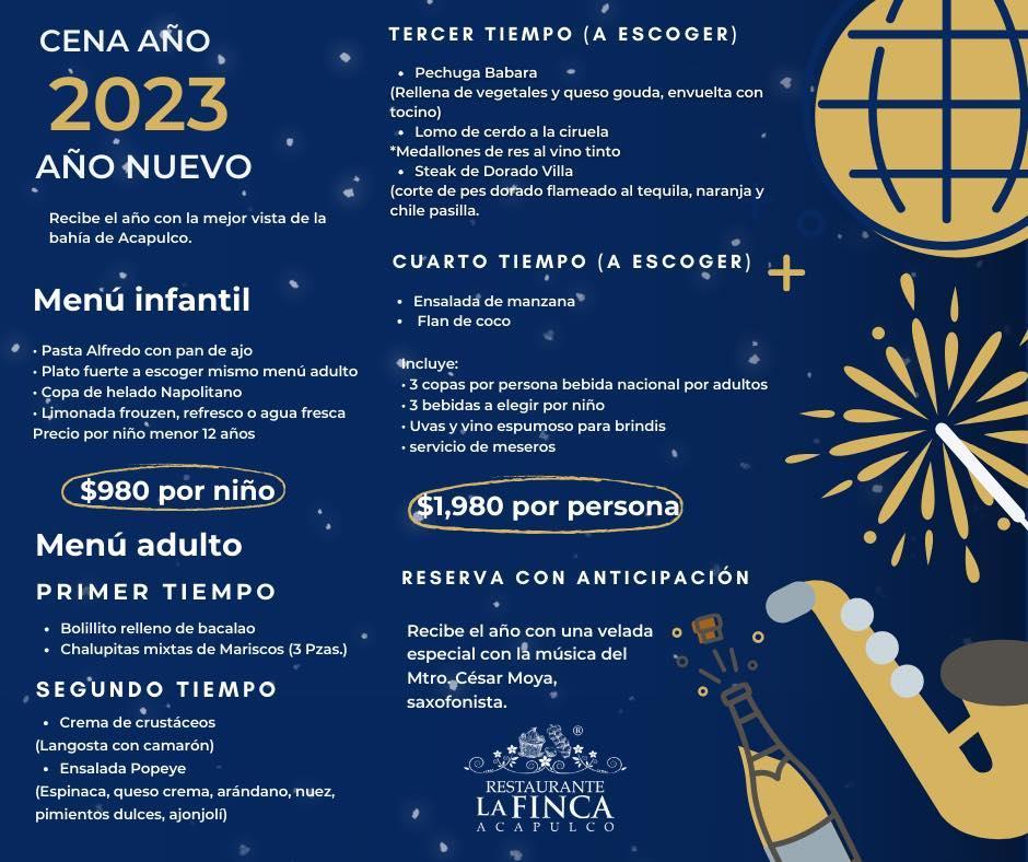 Para recibir al Año Nuevo en Acapulco, La Finca Costera tiene una velada especial para todos sus comensales. Todo empieza por su cena de cuatro tiempos que cuenta con diferentes platillos a escoger, con la finalidad de que todos escojan a su gusto la cena de su preferencia. Así también, incluye 3 copas de bebida nacional por personas, las tradicionales uvas, vino espumoso para brindar a la hora de la cuenta regresiva y el servicio de meseros.