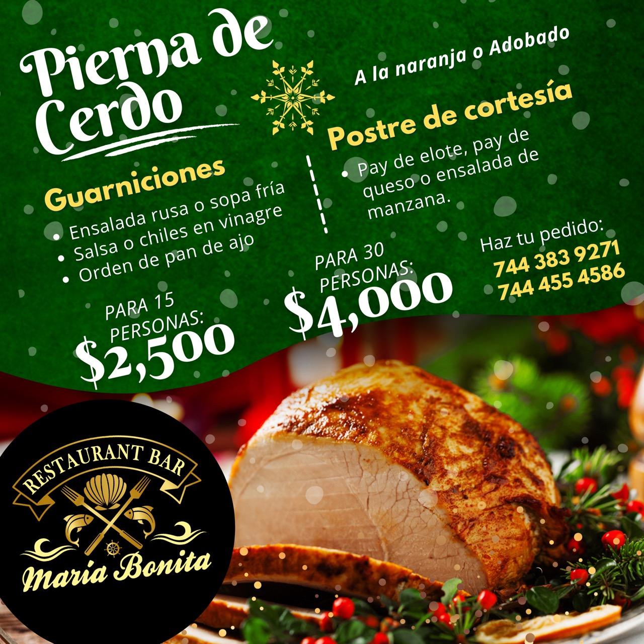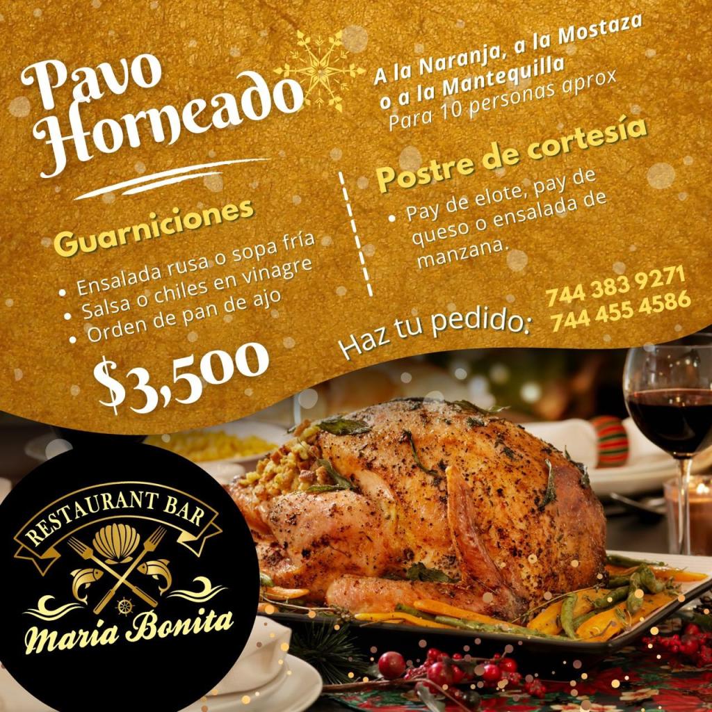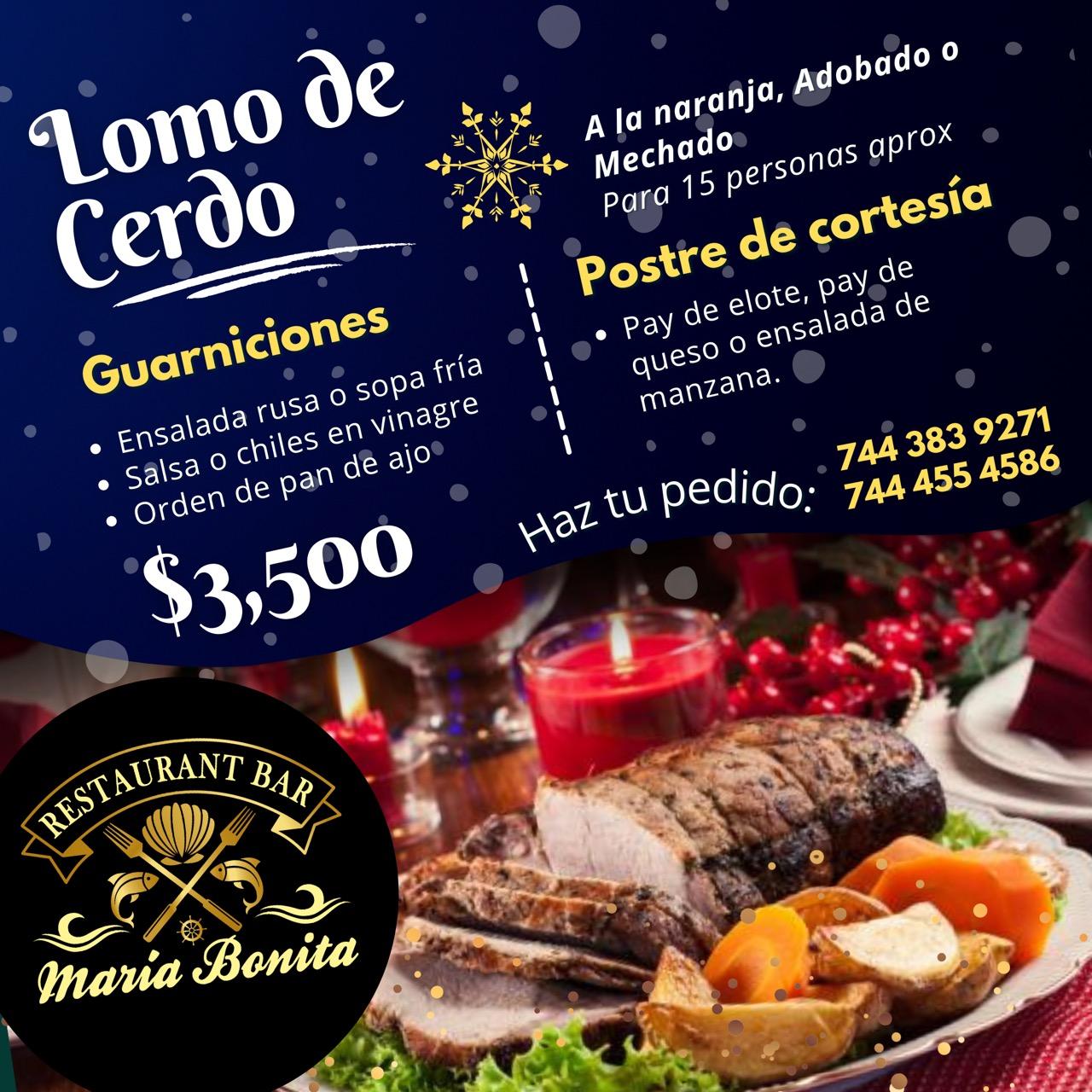 Ubicado en la zona de Llano Largo, el restaurante María Bonita tiene para todos sus comesales diferentes opciones para disfrutar y vivir la Noche Buena y el Año Nuevo sin mayor preocupación. Aquí existen seis diferentes opciones para elegir y disfrutar de ellas en casa; estas opciones pueden ser pavo, pollo, lomo y pierna de cerdo, lasaña y costillas a la BBQ.