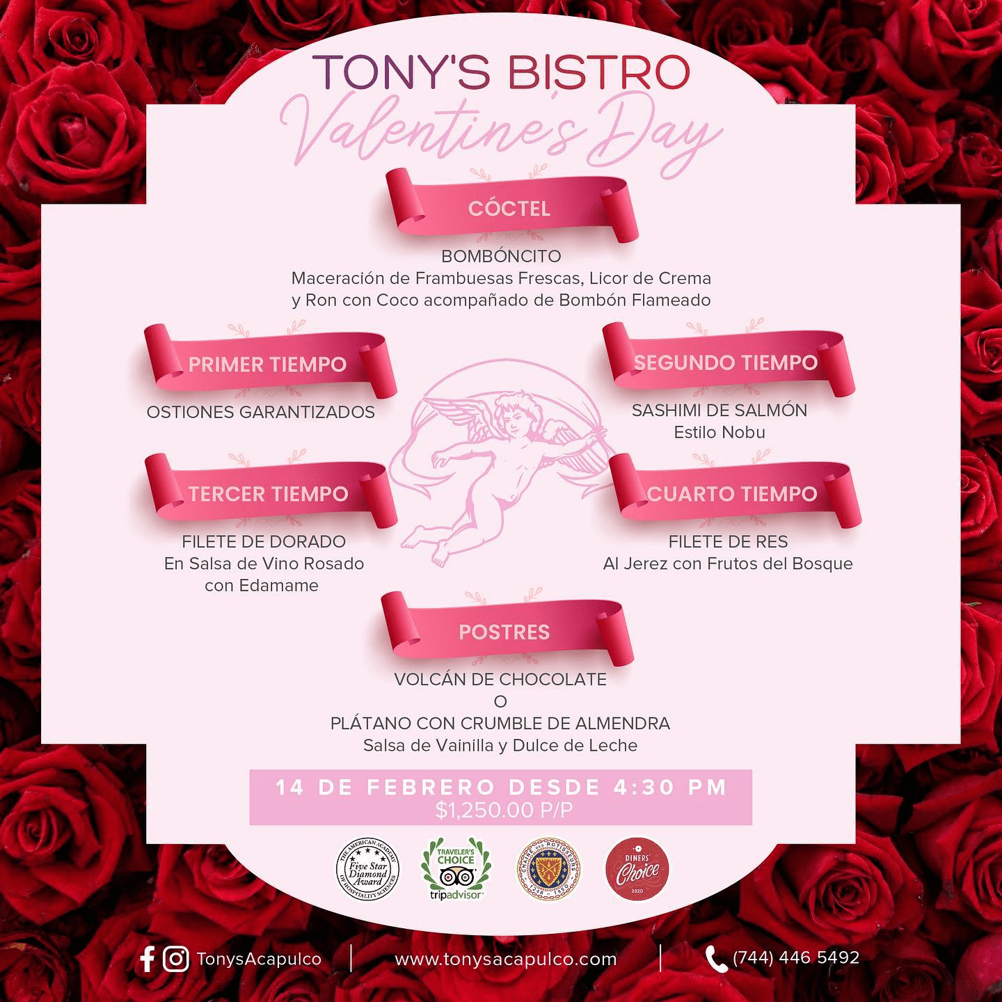 Tony’s siempre se ha caracterizado por una cocina internacional y fusiones únicas que dan como resultado platillos que vale la pena probar, por tal motivo, para esta ocasión y con la finalidad de celebrar el Día del Amor y la Amistad, ofrecen un menú compuesto por 5 tiempos, en donde podrán degustar de ostiones, sashimi de atún, un filete de dorado y un filete de res.