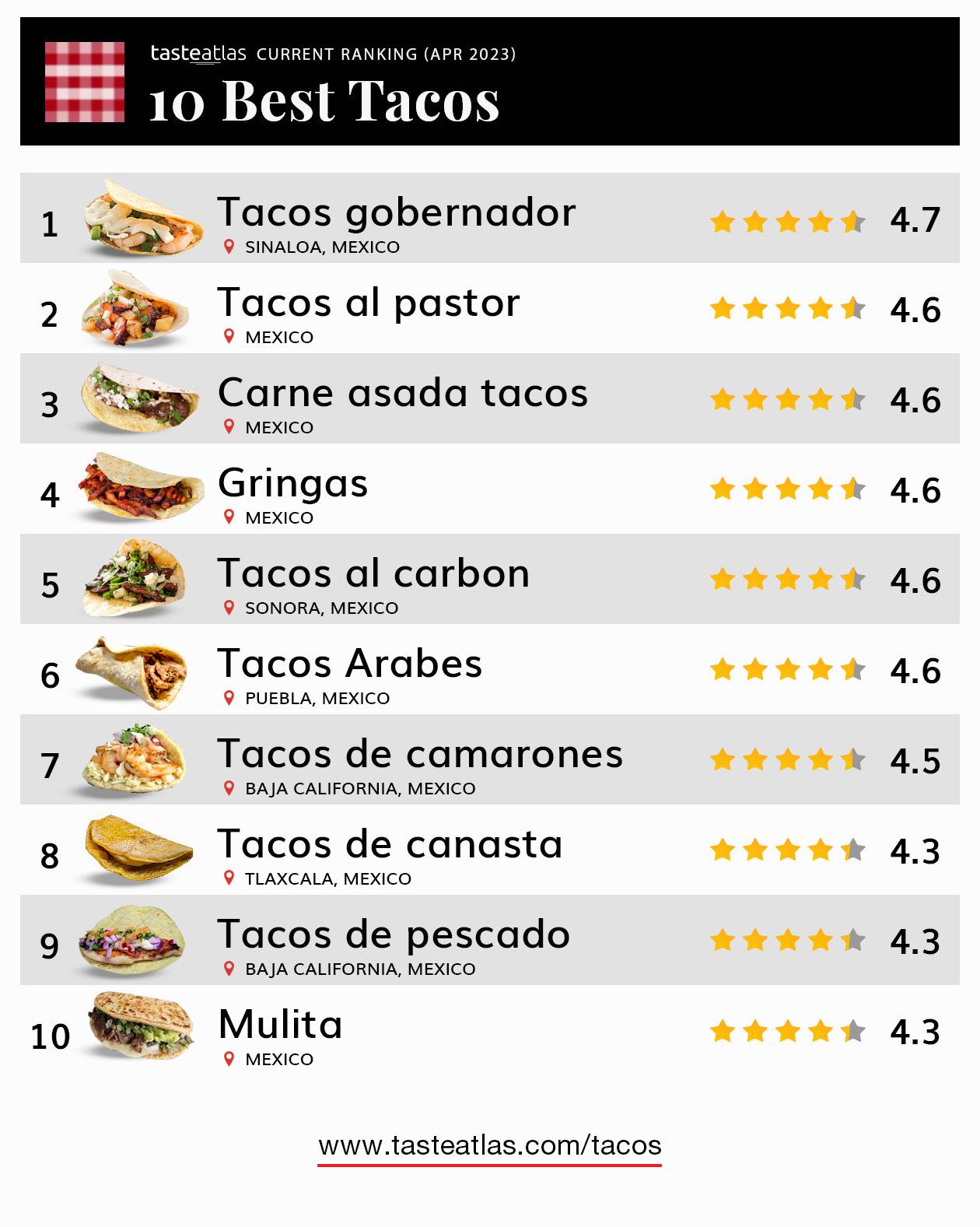La guía gastronómica internacional TasteAtlas ha publicado una lista de los mejores tacos de México, pero ha generado controversia en las redes sociales debido a la exclusión de algunos favoritos de los mexicanos. La lista, que incluye tacos de todo el país, ha dado como ganador a los Tacos Gobernador, originarios de Sinaloa y preparados con camarón, queso y chile poblano. En segundo lugar se encuentran los icónicos tacos al pastor, seguidos por los de carne asada y las gringas en el tercer y cuarto lugar, respectivamente. En el quinto lugar están los tacos al carbón, seguidos por los tacos árabes de Puebla y los tacos de camarones. Los tacos de canasta ocupan el octavo lugar, seguidos por los tacos de pescado y mulitas en noveno y décimo lugar, respectivamente.