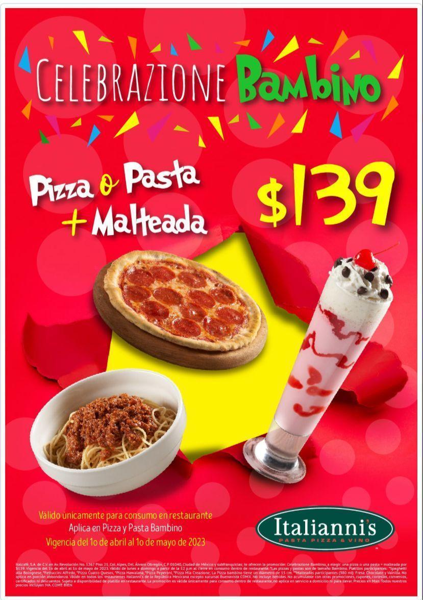 En Italianni’s van a consentir a sus pequeños de formas muy especiales. Aquí hay un menú especial para los niños y las niñas, para disfrutar de los sabores que tanto les encanta. Este menú consta de una pizza o una pasta mas una malteada, por tan solo $139 MXN.