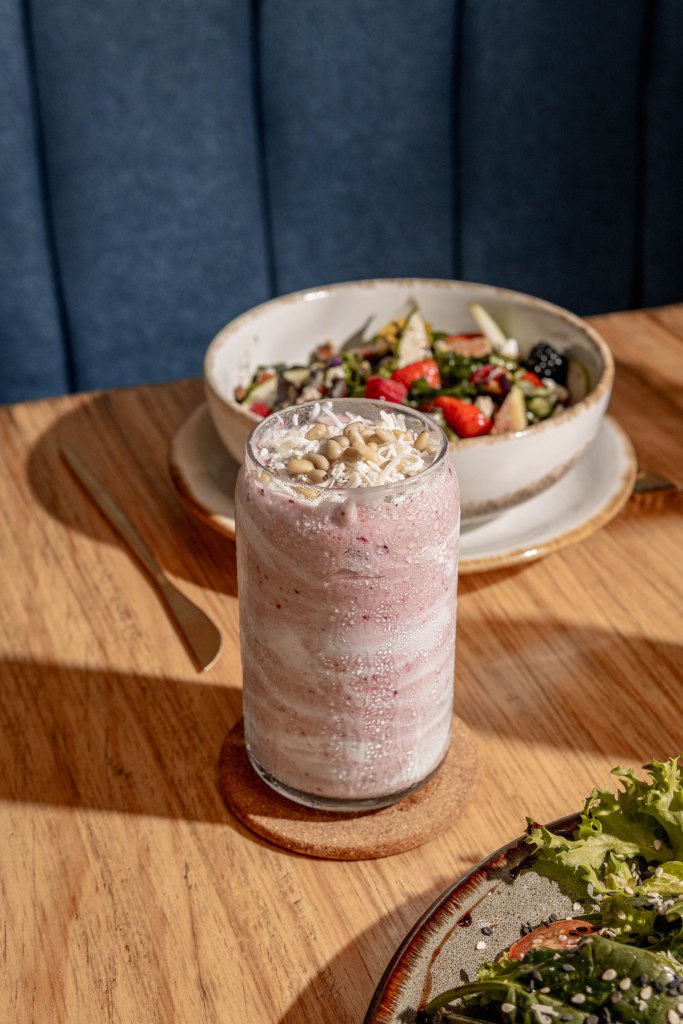 Entre las opciones más destacadas se encuentra el delicioso smoothie Berriegreek, preparado con leche de coco, fresa, zarzamora, frambuesa, plátano y jarabe de agave, y decorado con un toque de ralladura de coco. Cada sorbo es un deleite para el paladar, una combinación perfecta de sabores que te transportará a un paraíso tropical.