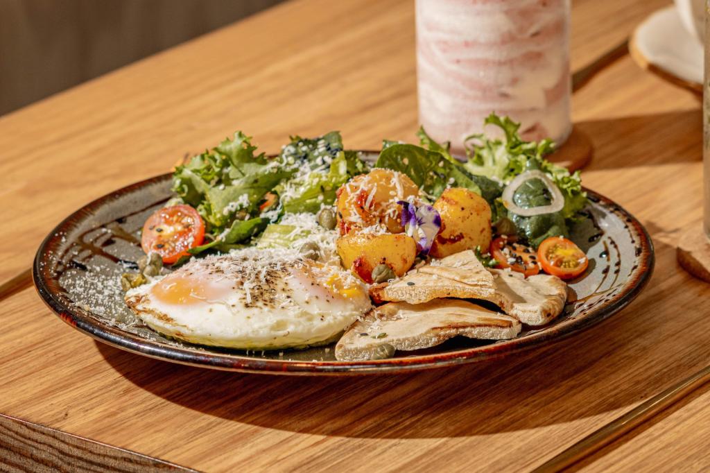 Otro plato que no debes pasar por alto son los huevos pita. Esta es una forma innovadora y deliciosa de disfrutar los huevos para el desayuno. Servidos sobre una cama de pan pita con aguacate, jocoque, ensalada de arúgula y papas cambray, y rematados con un toque de parmesano y alcaparras, los huevos pita son un nuevo clásico del desayuno saludable.