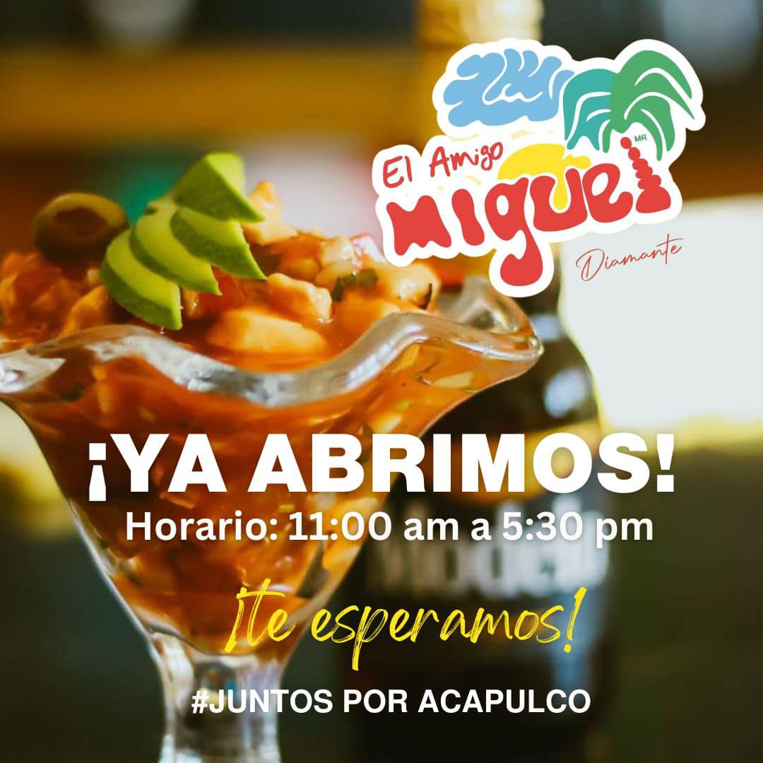 El Amigo Miguel Costera también anunció su reapertura, una vez que levantaron los escombros dejados por Otis, esta cadena acapulqueña con más de 53 años de trayectoria ha demostrado una vez más la resilienca que tenemos los acapulqueños para levantarnos ante toda circunstancia. Visítenlos en su sucursal ubicada en Costera Miguel Alemán, sobre la playa Tamarindos.