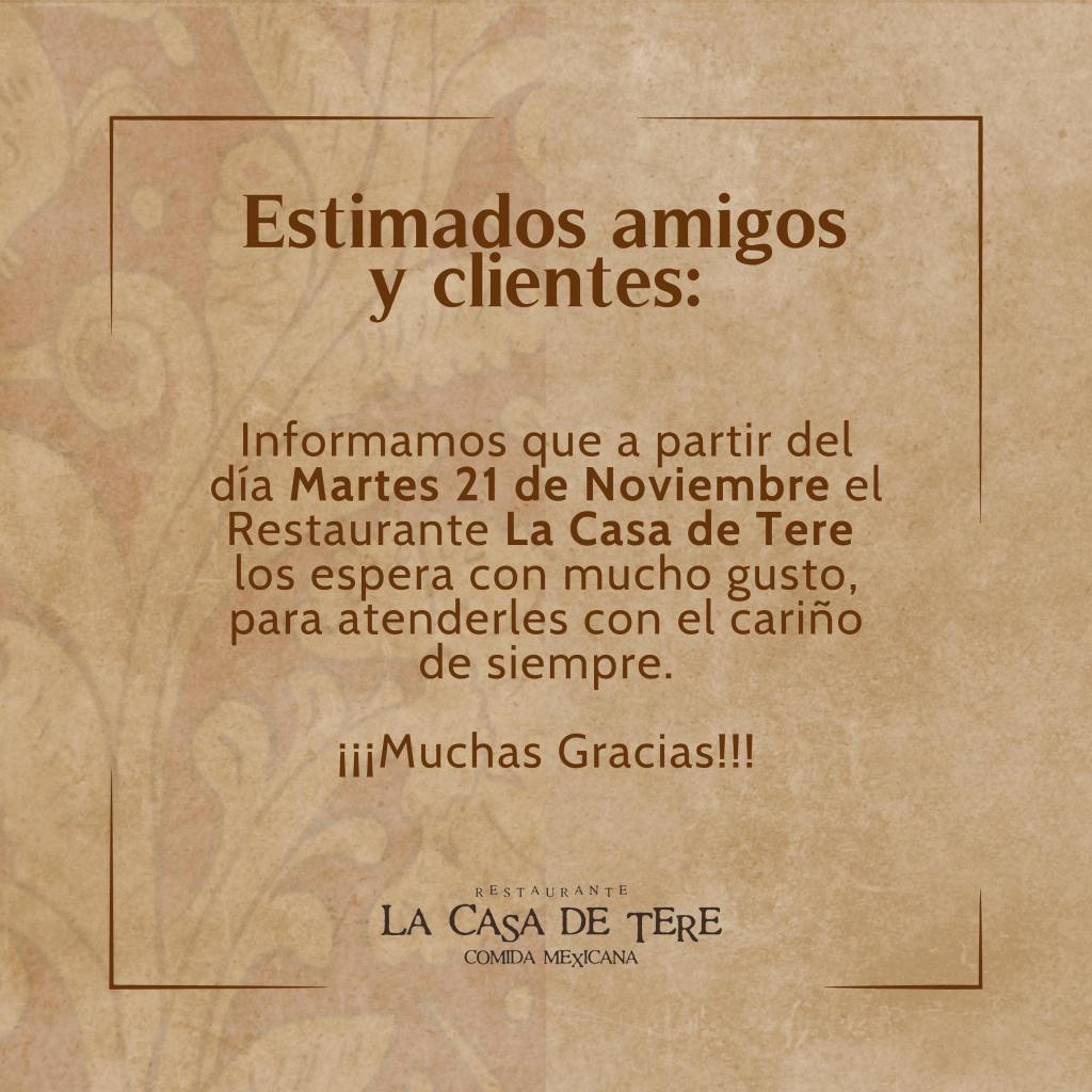 Otra reapertura que nos complace anunciar es la de nuestros amigos de La Casa de Tere, quienes cerraron sus puertas por varias semanas después del paso de Otis, y del sensible fallecimiento de Doña Tere Cabrera, fundadora de este restaurante que por más de 20 años ha recibido a famiias enteras por generaciones.