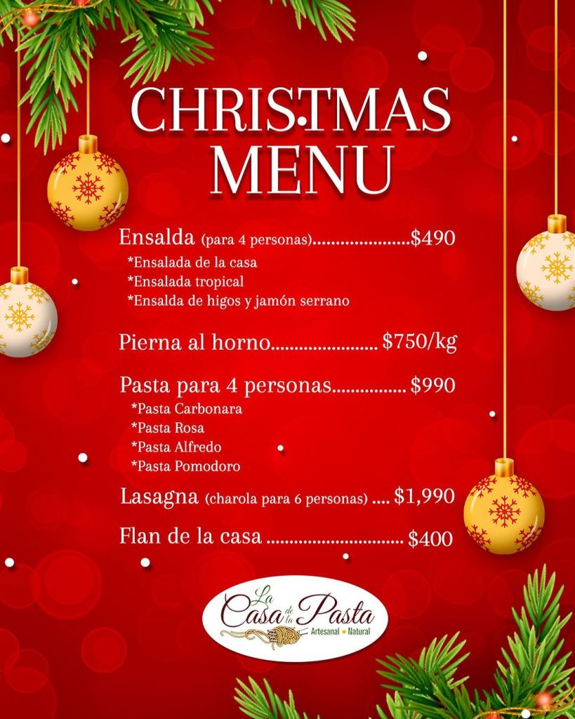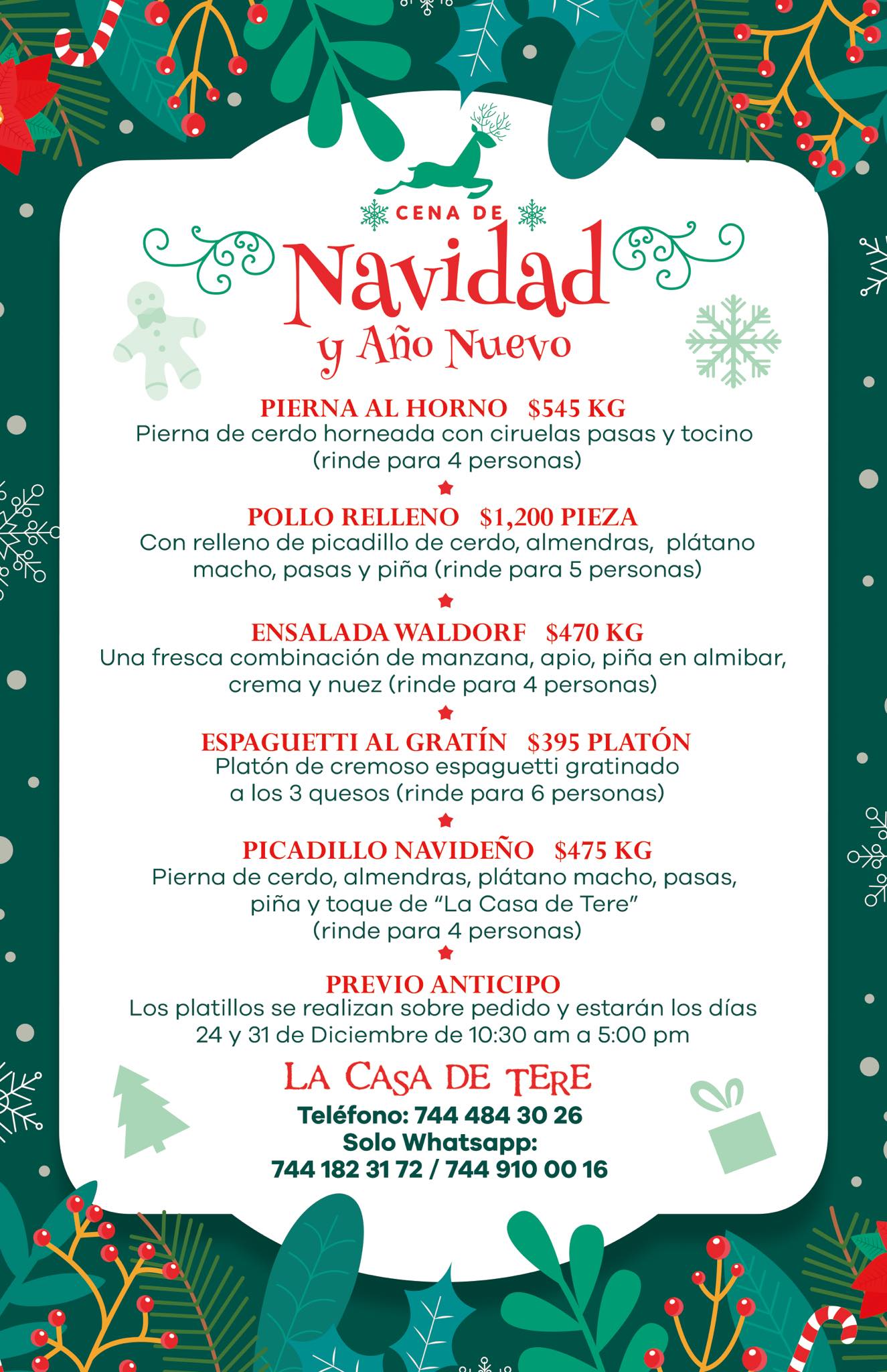 Pueden elegir entre pierna al horno y lasaña, así como guarniciones de ensaladas y pasta. Y, por si fuera poco, existe la posibilidad de adquirir con ellos el postre del flan de la casa. Pueden realizar sus reservaciones para recoger el mismo 24 de diciembre al teléfono 744 466 2683 o a través de WhatsApp al 744 448 3436.