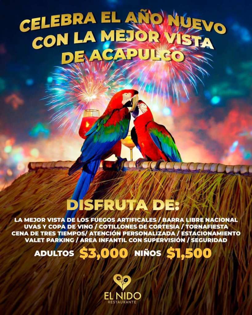 Ubicado en la cima del cerro del Mogote, en el interior del Parque Papagayo, El Nido ha abierto recientemente sus puertas para comenzar a operar con la actitud positiva que les caracteriza. Para esta cena, podrán degustar de un menú de tres tiempos, barra libre nacional, las tradicionales uvas y vino espumoso para brindar, una tornafiesta con chilaquiles y un área infantil especial para los pequeñines, para que todos se diviertan en grande y festejen la vida al máximo.