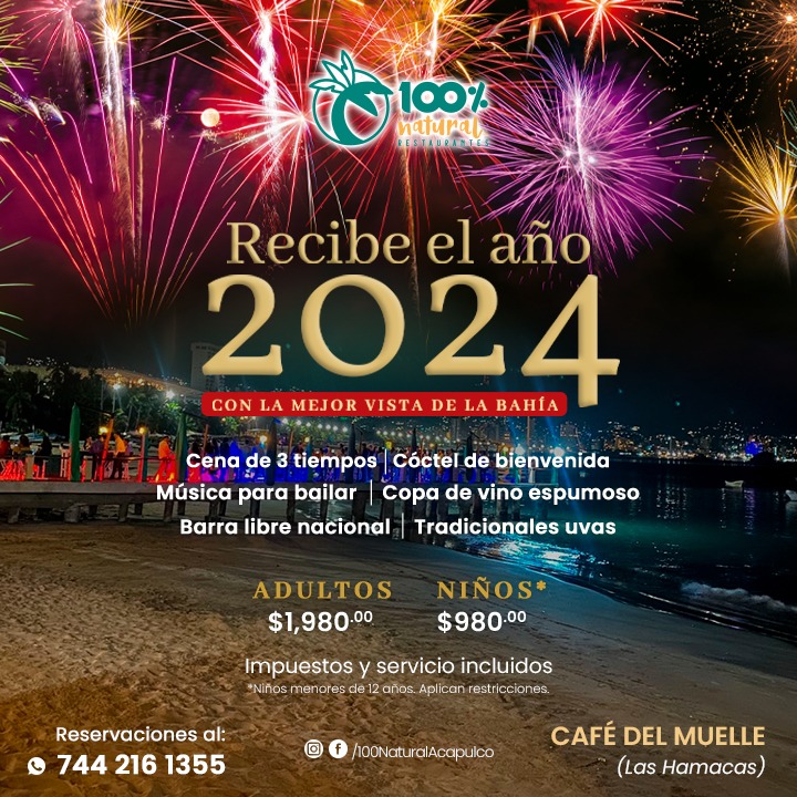 En 100% Natural podrán despedir el 2023 y recibir al 2024 con una de las vistas más espectaculares de todo Acapulco. Para esta cena, tendrán la posibilidad de disfrutar una cena de 3 tiempos, en donde además habrá una barra libre nacional, una copa de vino espumoso y un delicioso coctel de bienvenida.