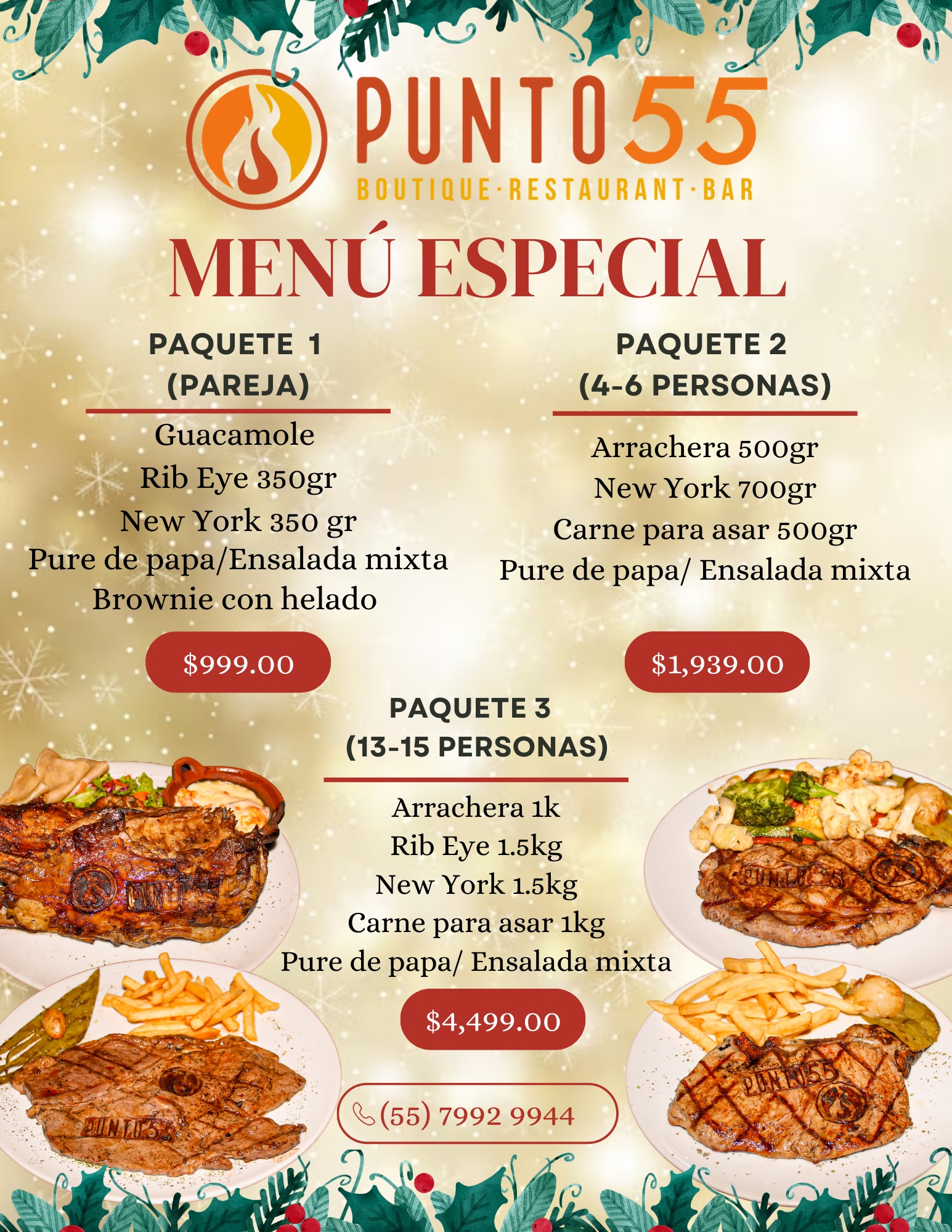 Otra opción para los amantes de la carne y para disfrutar en casa es Punto 55. Este delicioso lugar cuenta 3 paquetes para disfrutar en esta Navidad, los cuales se pueden disfrutar en pareja o en familia. Todos ellos cuentan con carnes y puré de papa o ensalada. Así pueden escoger entre los tres de acuerdo a sus necesidades.