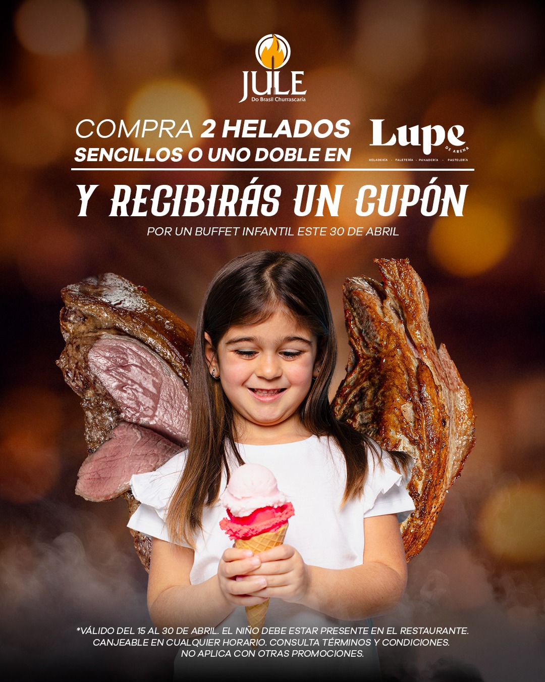 En Jule do Brasil, el Día del Niño viene acompañado de un plan delicioso: si consumes dos helados sencillos o dobles en Lupe de Arena (ubicado en Costa Azul) recibirás un cupón para que un niño coma gratis en el buffet especial que tendrán el 30 de abril. Una excelente manera de combinar un paseo por la ciudad, un antojo dulce y una buena comida en familia.