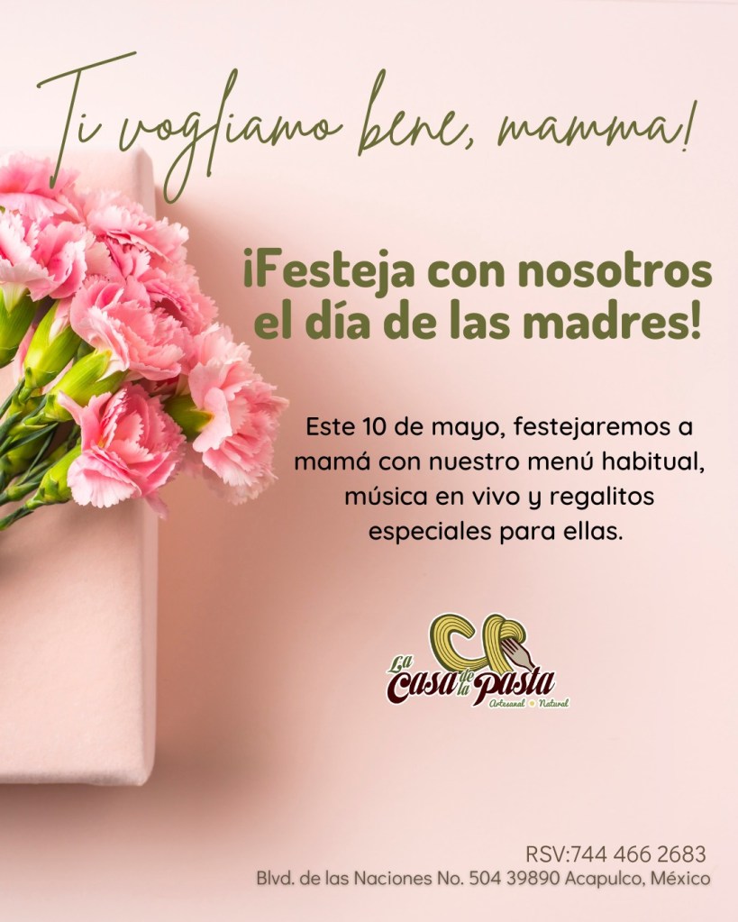 Para quienes aman la comida italiana y buscan un entorno íntimo, La Casa de la Pasta tendrá música en vivo con Tony Castañeda y pequeños regalos para todas las mamás. Sus pastas hechas al momento, sus salsas cuidadas y su atención personal hacen que cada comida se convierta en un pequeño homenaje. Un lugar perfecto para decir “te quiero” entre risottos y copas de vino.